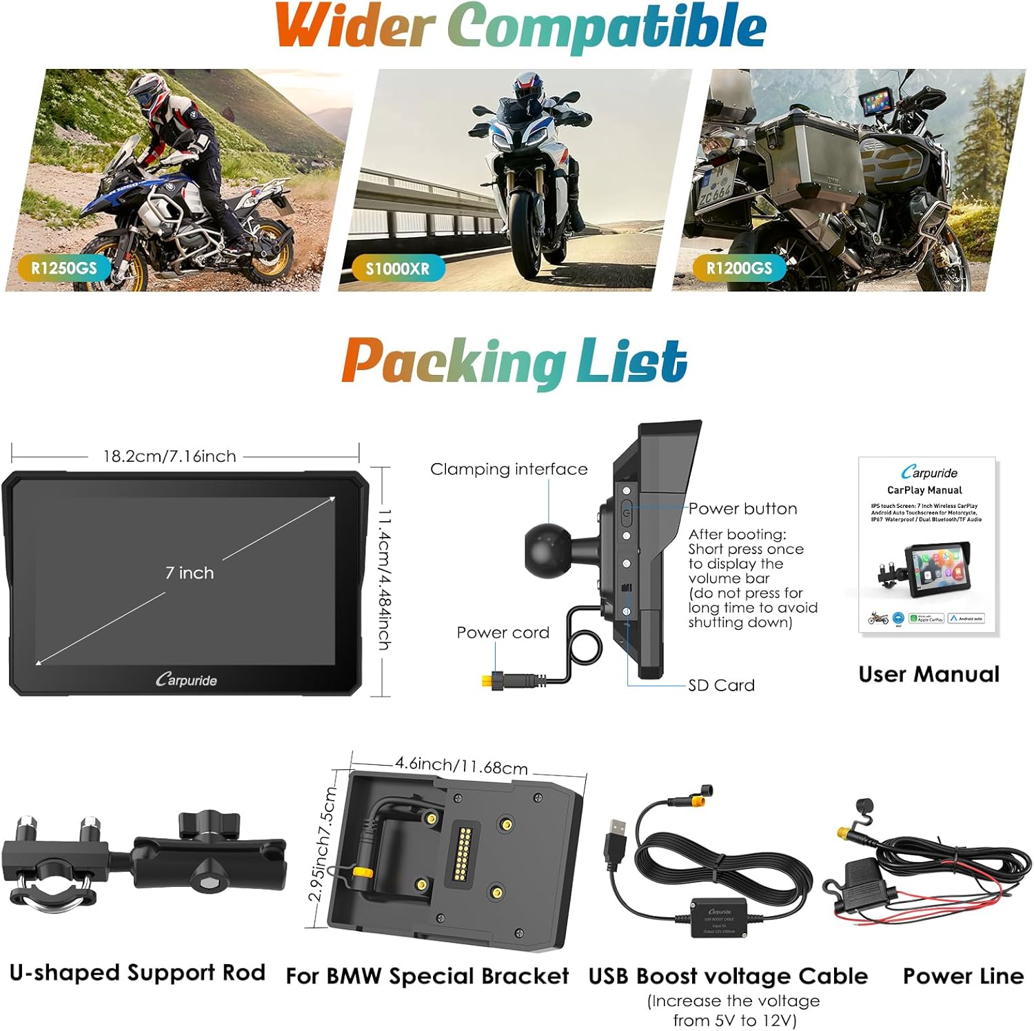 Pantalla Carplay para Motocicleta Carpuride W702B para BMW R1200GS R1250GS S1000XR, Pantalla Táctil Resistente al Agua de 7 Pulgadas, Navegación GPS Portátil Carplay/Android Auto para Motocicleta, Bluetooth Dual