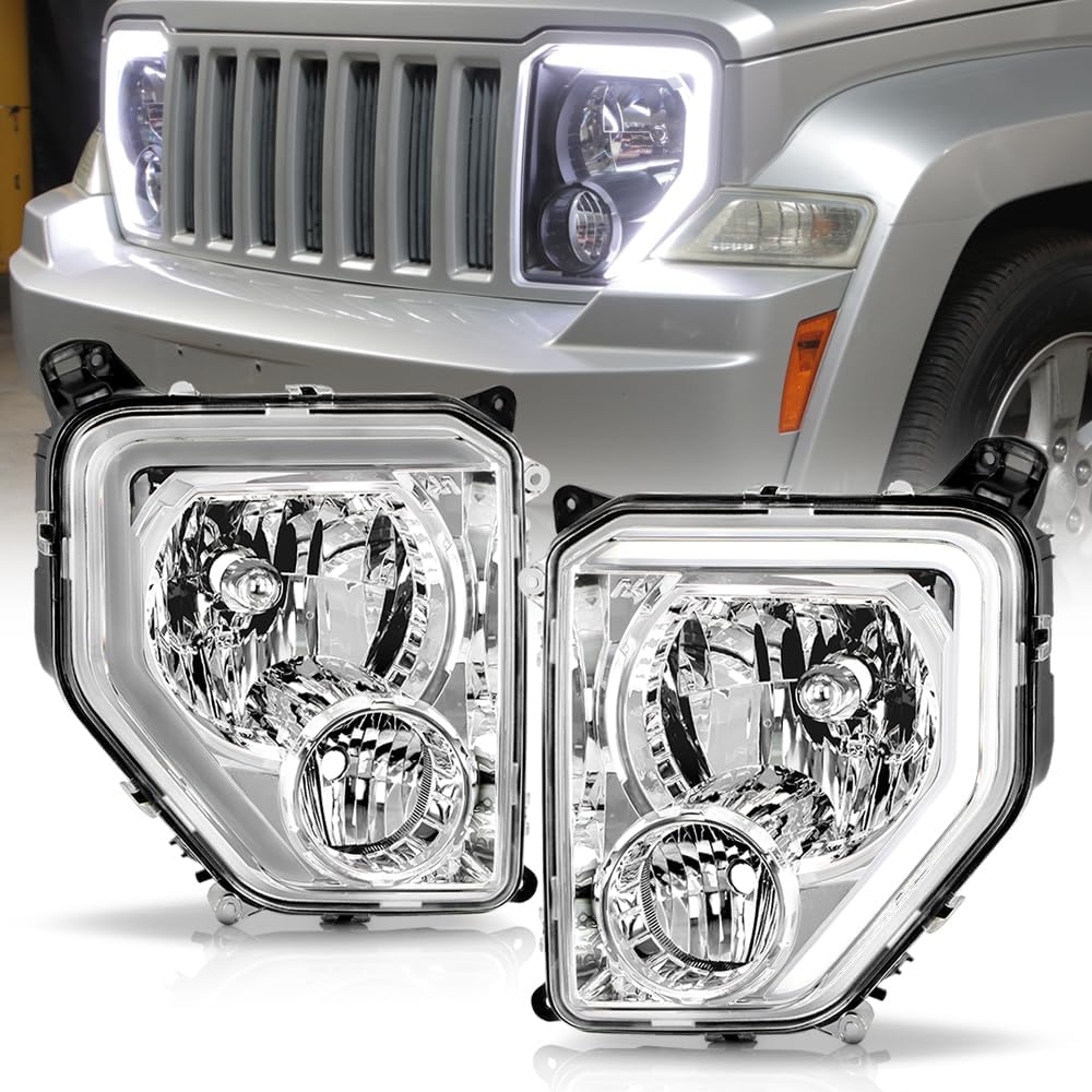 DESIGNED REPLACEMENT FOR2008-2012 Jeep Liberty w/ Fog Lamp Headlight Model[4-Door Sport Utility]OEM Equivalent Part Number: 55157339AE, 55157338AE, CH2502196, CH2503196Attention:[Compatible Headlamp w/ Fog Light Models Only][Not Compatible w/o Fog Light Models]Condition: NewColor: Titanium ClearChrome Housing | Clear LensPackage Include: Driver & Passenger Side (Housing & Lens)PRODUCT FEATUREBullet-Cap LED:Our Lights have Tech-Leading DIP LED's which illuminate up to 10x faster than incandescent bulbs alerting trailing drivers sooner for added safety while bringing a new modern look to your vehicle with brighter, more efficient lightingPlasma-Tube:Our "Plasma-Tubes" offer an Intense Lighting Accent that is DRL compatible, giving your Vehicle a Aggressive Night PresenceLens:Our Polycarbonate Lens offer Superior UV protection and a High Impact ResistanceCondensation and Debris Protection:Our Lights Use the Highest Quality Butyl Sealant to Prevent any Imperfections to Enter the Light Housing