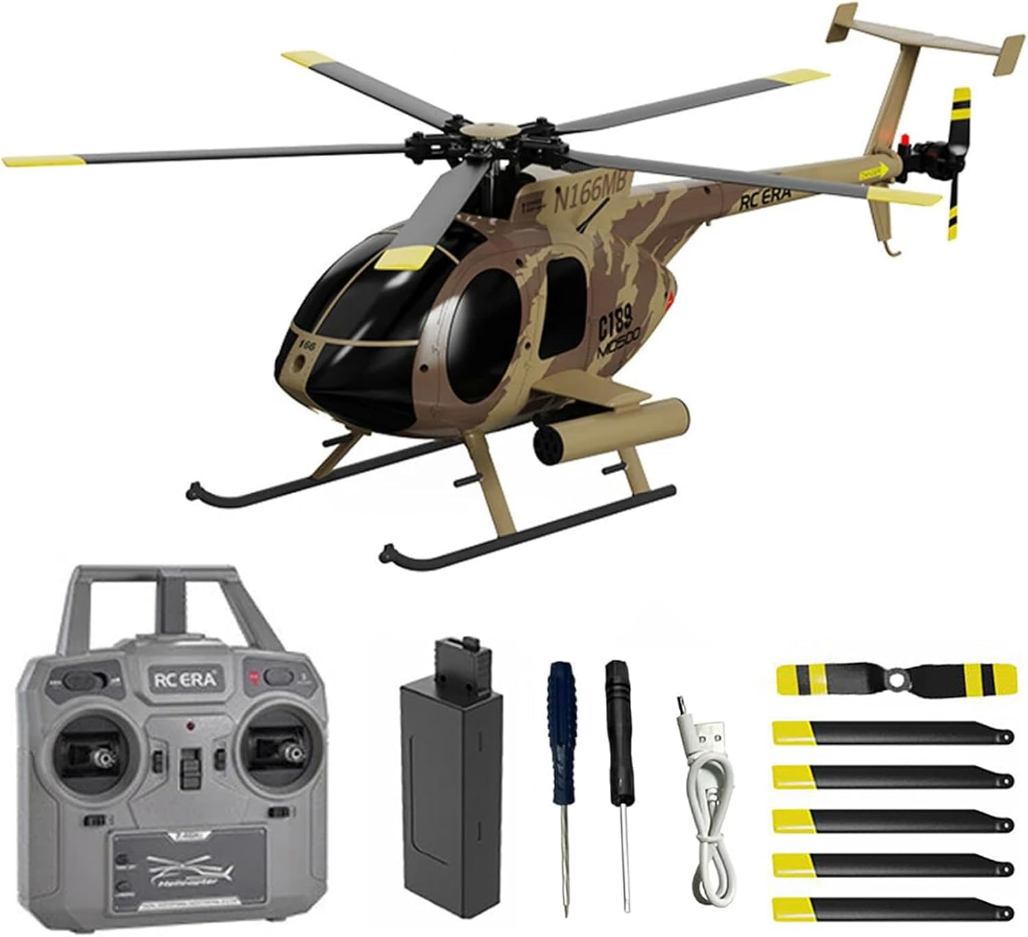C189 Remote Control Helicopter, 1:28 Scale MD500 Defender Military Helicopter, 2.4G 6CH RTF Brushless Motor Single Blade Flybarless Optical Flow Localization-1 Battery