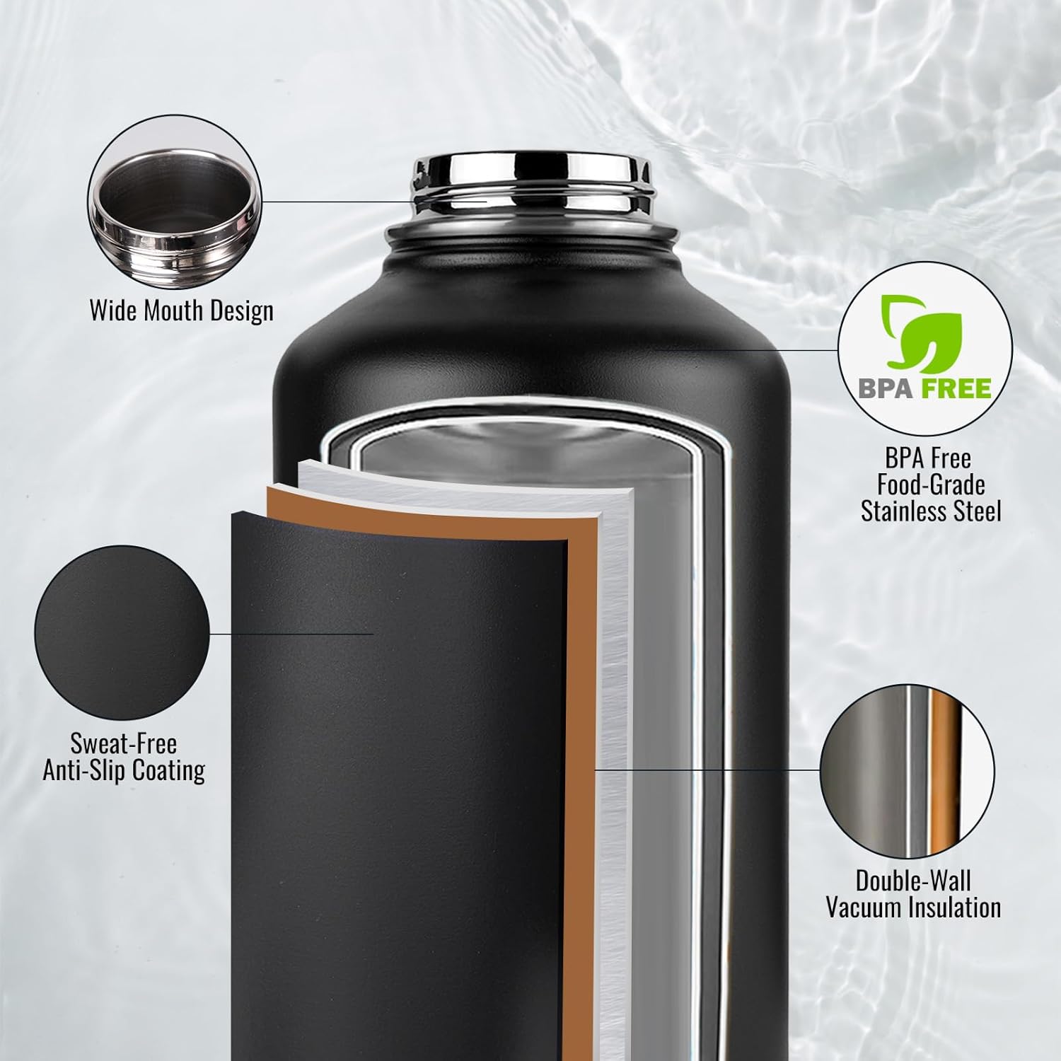 Gallon Water Bottle with 2 Lids (Straw & Spout), 304 Stainless Steel Water Jug with Handle and Wide Mouth, 1 Gallon Vacuum Double Walled Jug for Sports, Outdoors, Leak-Proof, Black 128 oz