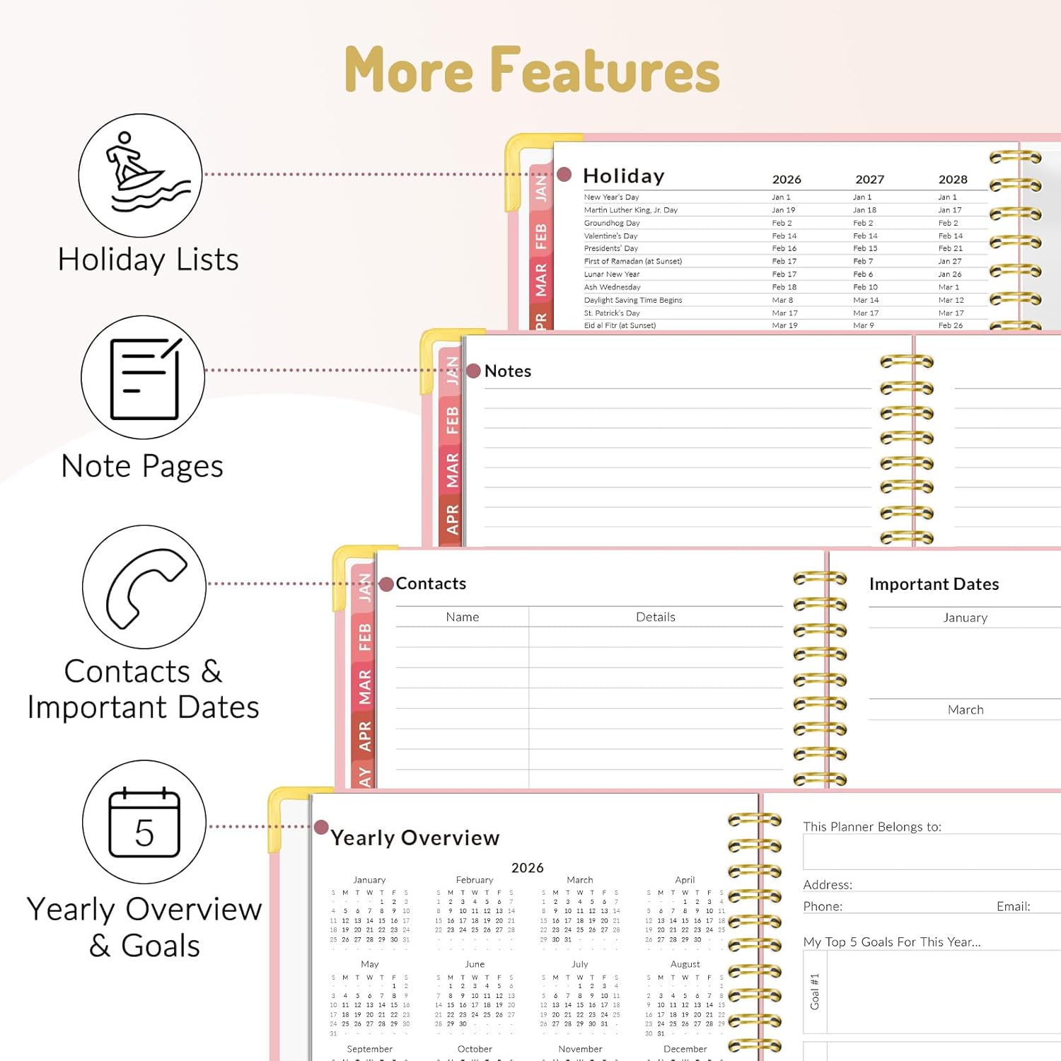 Additional Planner Features: This calendar planner starts with Yearly Goals page for goal setting. It also includes reference calendars, contact page, important dates page and holiday lists to keep on top of your special dates. Bonus extra notes pages to jot down your thoughts