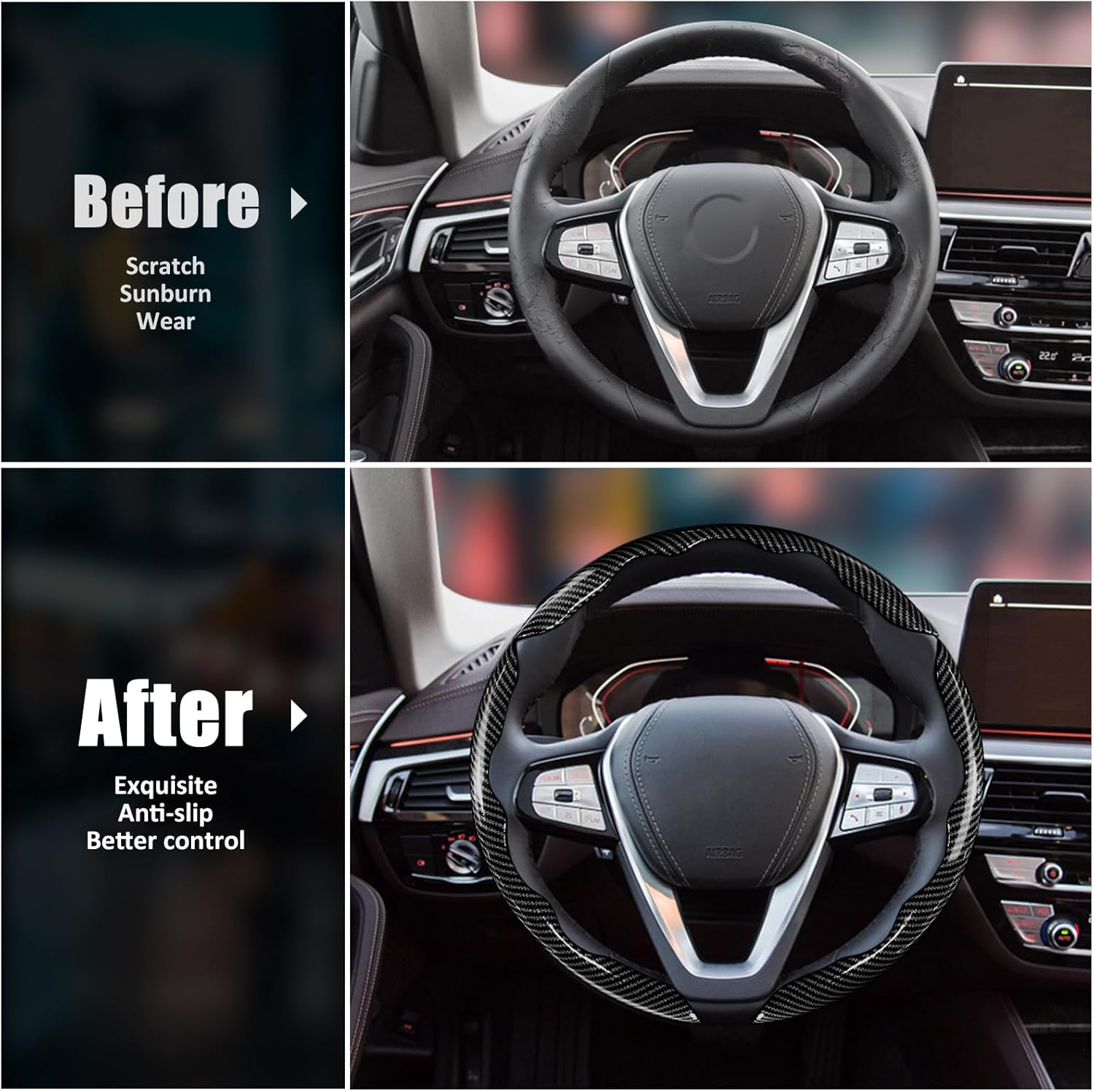 Increased Safety: The anti-slip lining on the inside of the steering wheel cover carbon fiber won't scratch your original steering wheel. It can fit snugly on your wheel to provide better grip, which gives you more control and sense of security on the road.