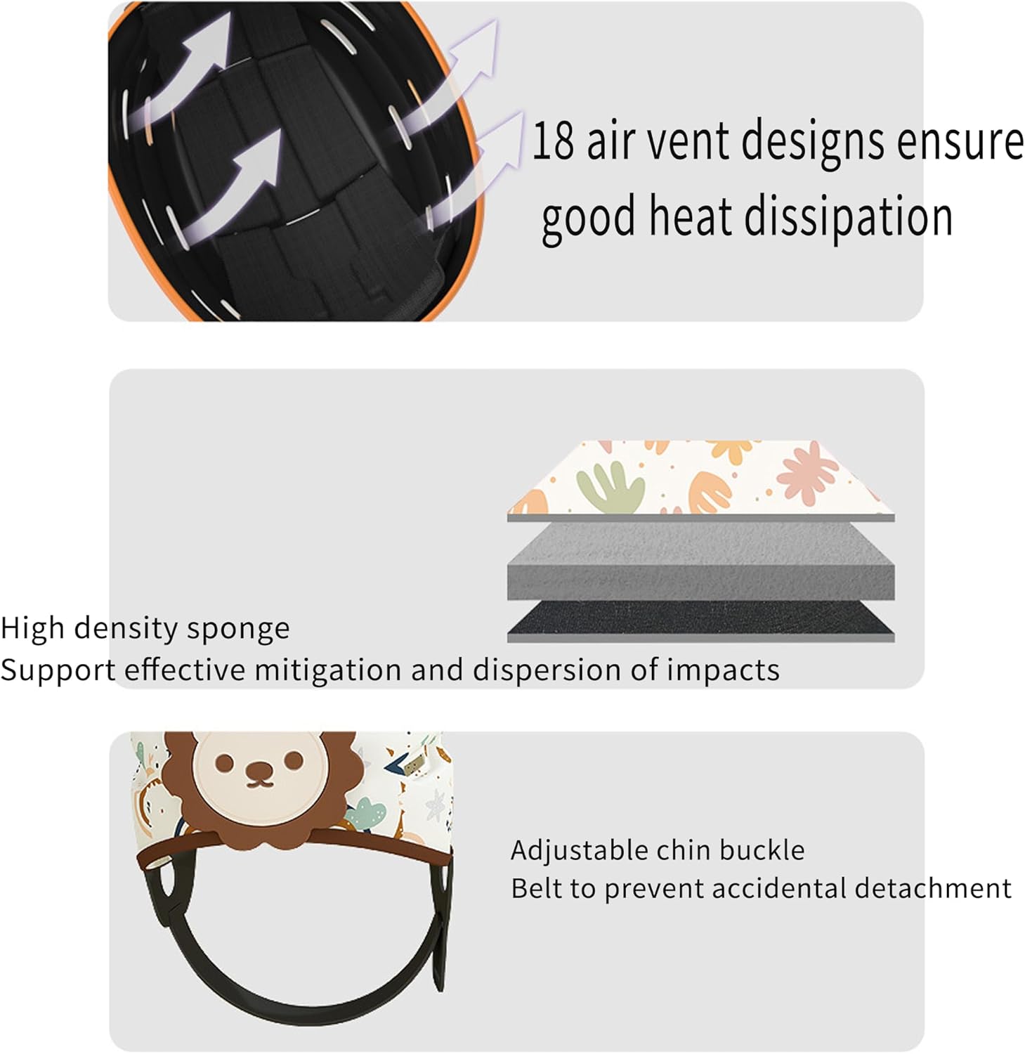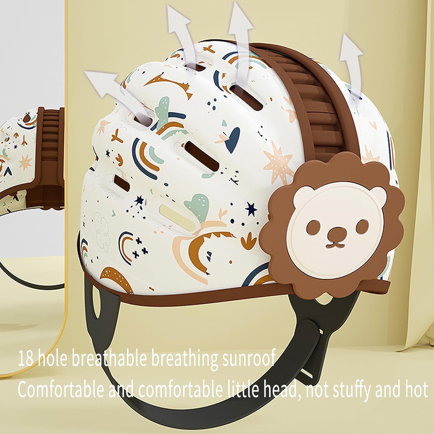 Impact resistant EVA foam: The helmet is filled with EVA foam. This material has excellent impact resistance, which can effectively absorb the impact force generated by hard objects such as sharp corners and protrusions in case of accidental fall or collision, and protect the head safety of the baby in all directions.