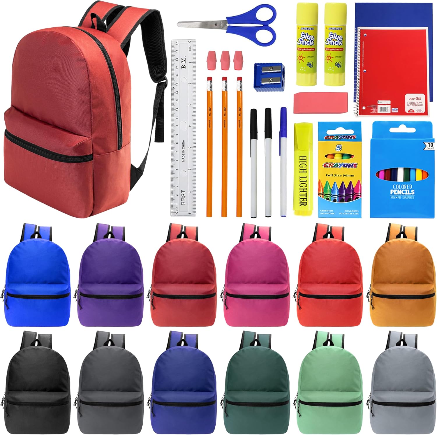 17 Inch Bulk Backpacks with 34 Piece School Supply Kit - Case of 12 Wholesale Backpacks in 12 Assorted Colors