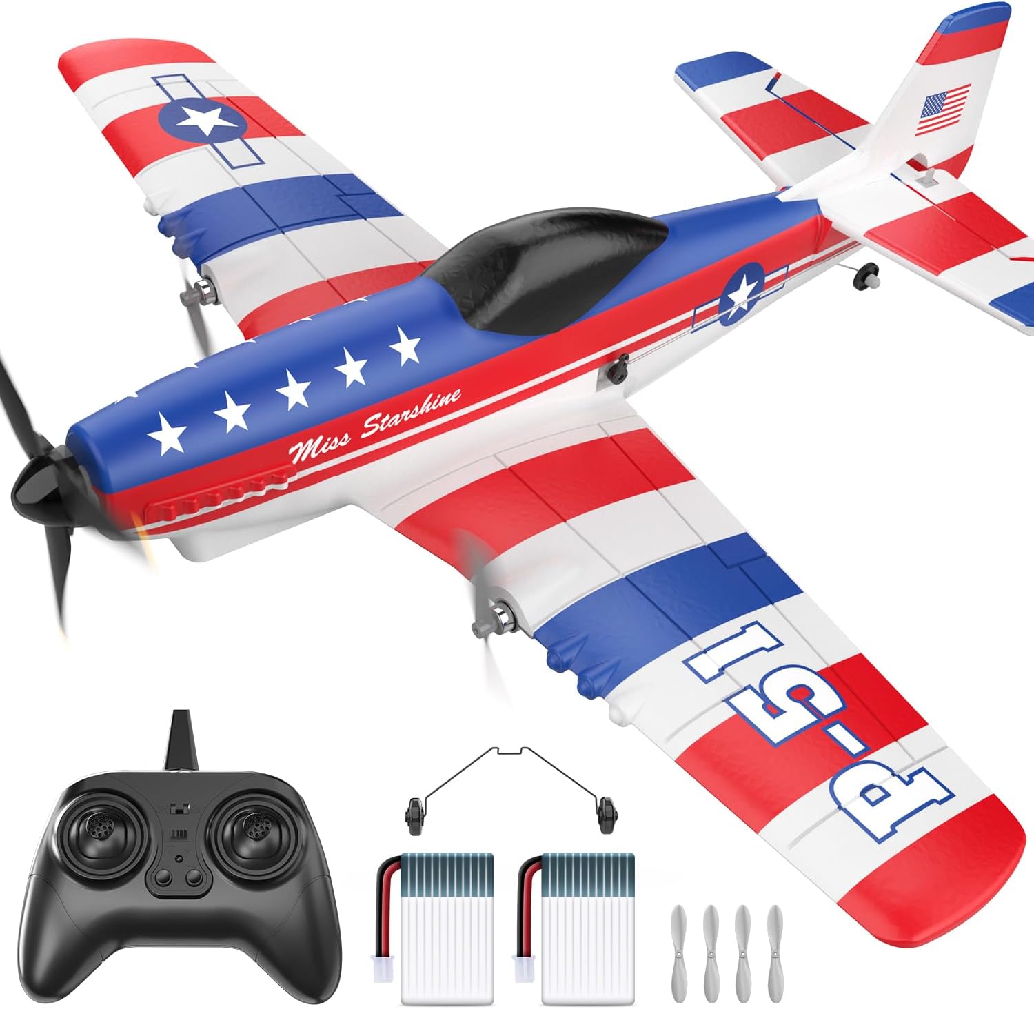 DEERC RC Plane 3 Channel P51D Mustang Remote Control Airplane Fighter Toys,2.4GHz 6-axis Gyro Stabilizer RTF Glider Aircraft Plane with 2 Batteries,Easy to Fly for Adults Kids Beginners Boys