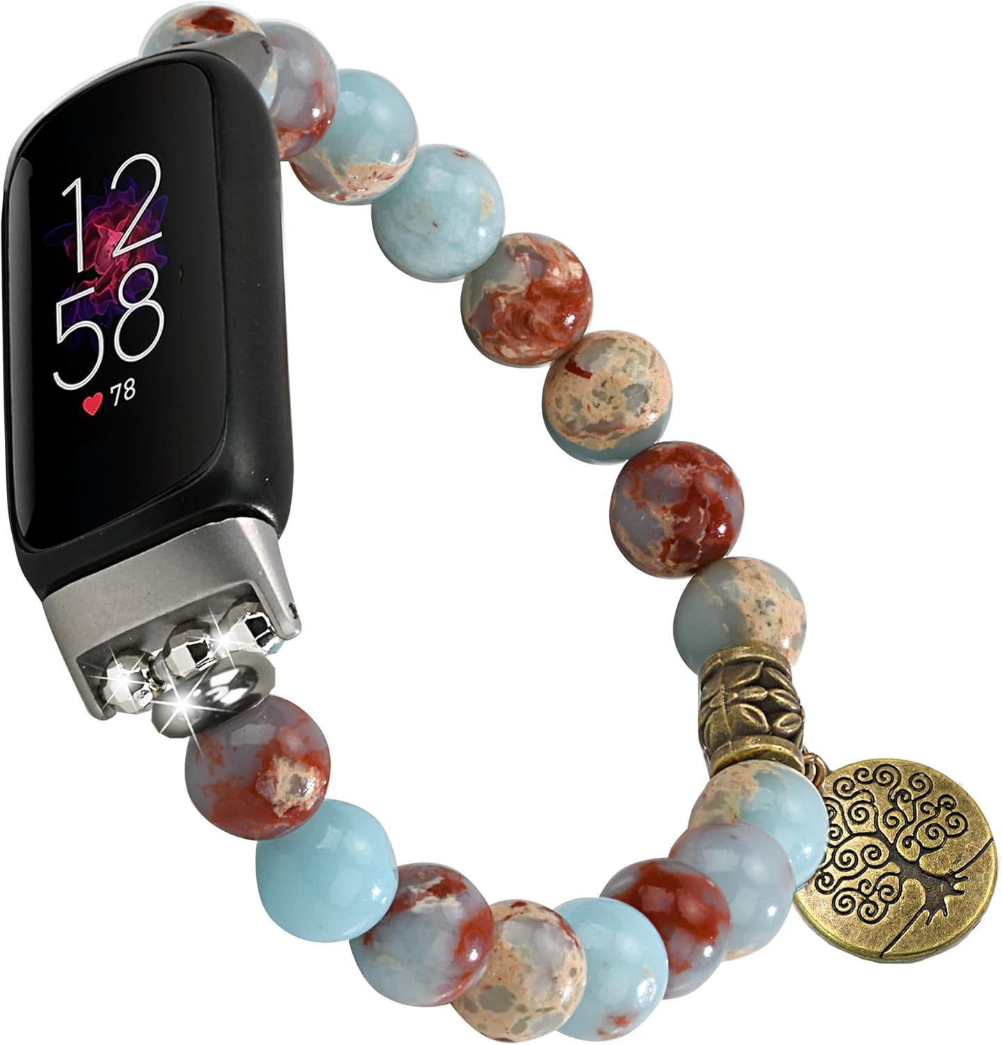 Wongeto Compatible with Fitbit Luxe Band Natural Gemstone Beaded Handmade Elastic Stretch Bracelet Tree of Life for Women
