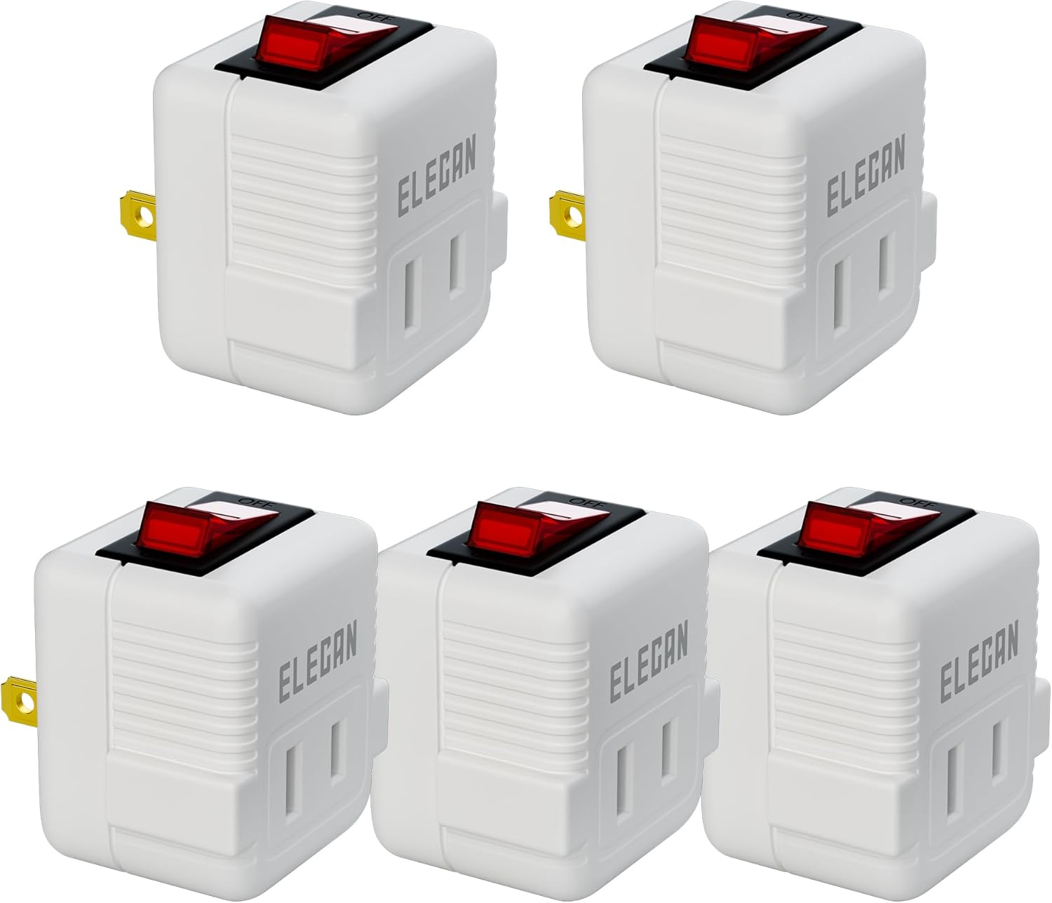 Elecan 2 Prong Outlet Extender with On/Off Switch (5 Pack), Power Switch Outlet Adapter Wall Tap, Energy Efficient Adapter for Small Appliances, Space-Saving Design, Travel Essentials,ETL Listed,White
