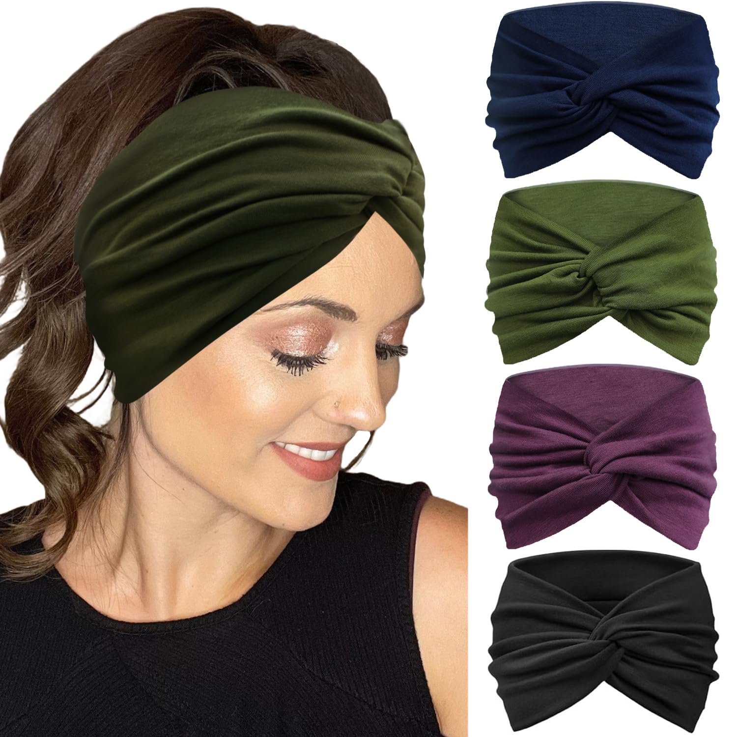 IVARYSS Extra Wide Headbands for Women Non-Slip, 7'' Large Twist Knotted Stretchy Wraps Head Bands Hair Accessories, 4 Pack, Solid Color