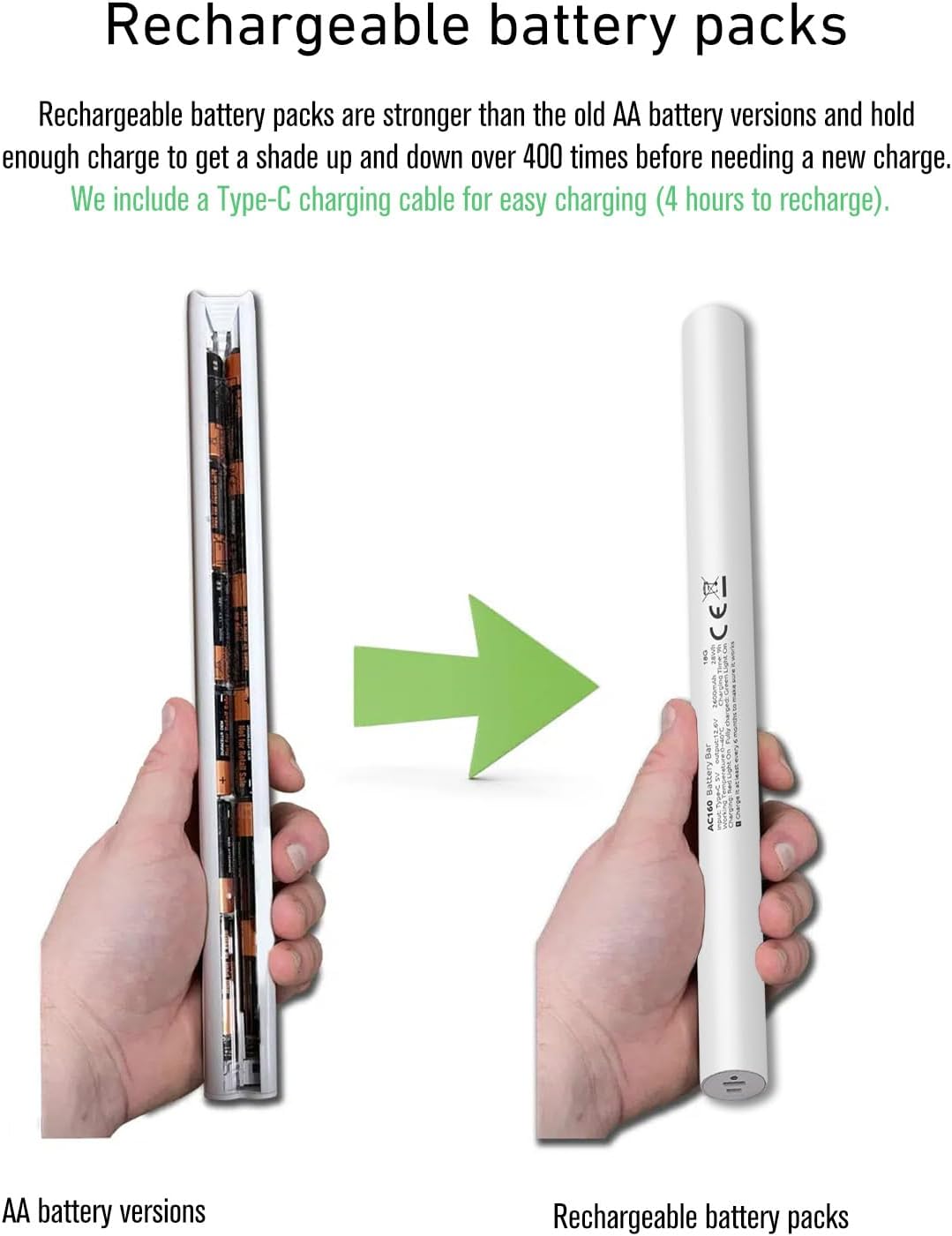 No more batteries---Lithium Ion pack makes the shades much snappier and the the operation is quick, a good replacement for 8xAA battery wand