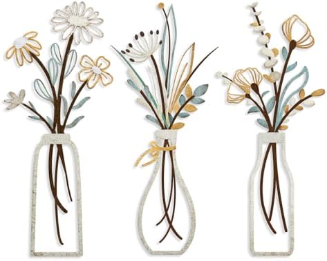 Pigort 3 Pieces Metal Flowers Wall Arts - Rustic Farmhouse Decor Beige Minimalist Flower Wall Decors for Living room Bathroom Bedroom Dining Room-Housewarming Gifts (Beige, Vase-C)