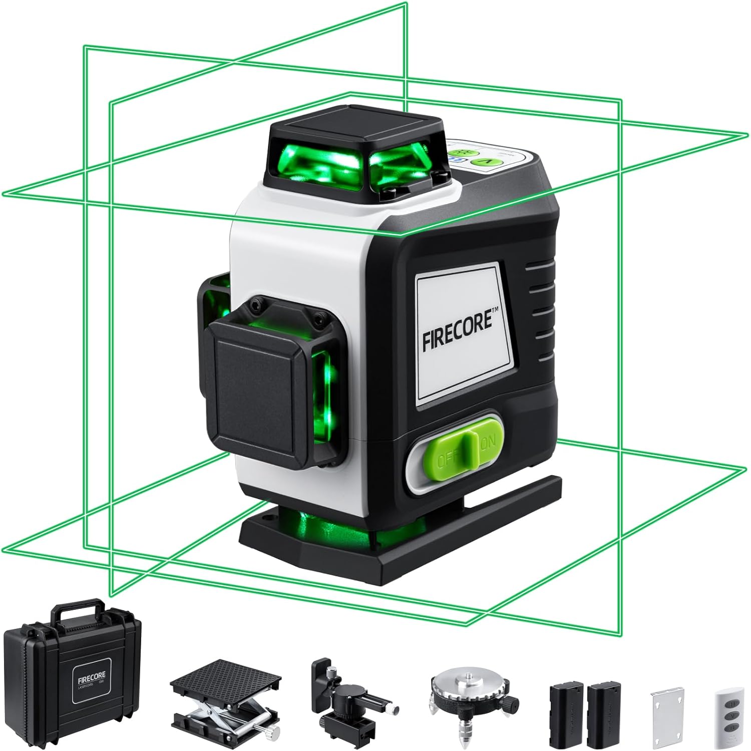 Firecore 4 x 360 Laser Level Self Leveling, 16 Lines Green Beam 4D Cross Line Tiling Floor Tool, 3 Gear Brightness Adjustment/Pulse Mode for Construction, 2 Li-ion Batteries, Remote Control included