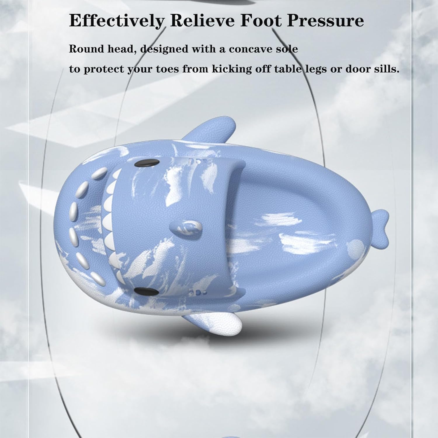 🐬【Super Soft & Thick Sole】: The 1.6-inch thick sole provides ample height and cushioning for the feet. The shark slide are ergonomically designed to equalize the pressure on the foot, so you won't get tired after wearing it for a long time.
