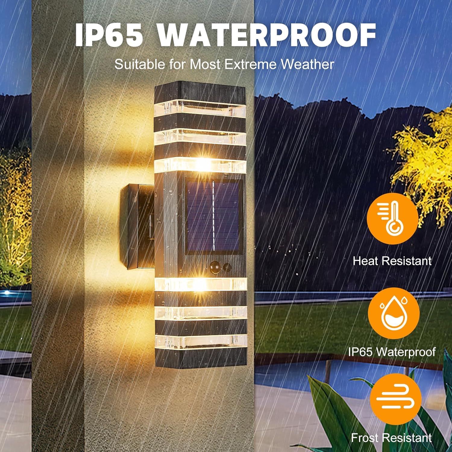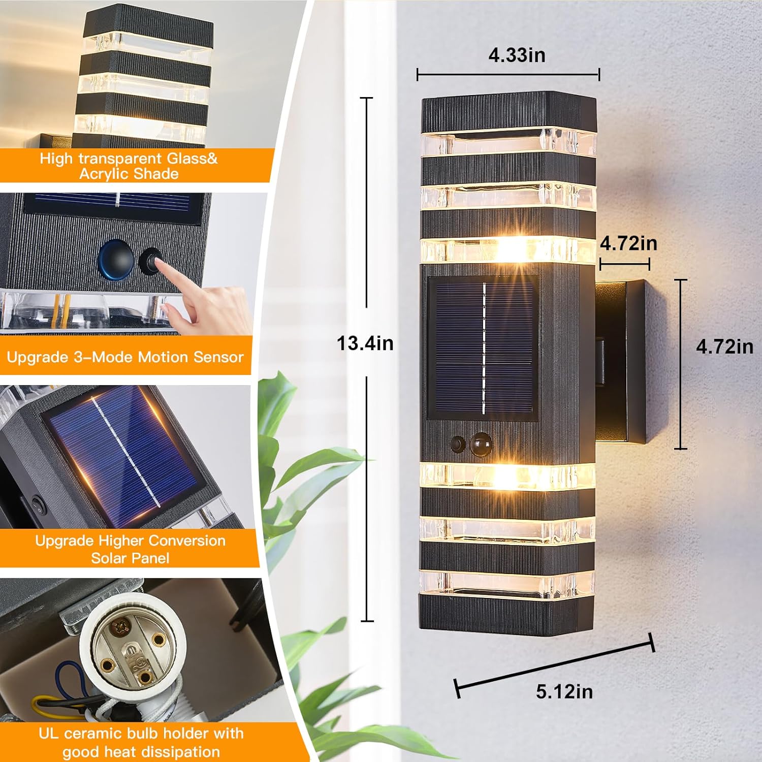 🚶【UPGRADE MOTION SENSOR & DUSK TO DAWN FUNCTIONG】:This High performance Exterior Solar Wall Lights has 3 Lighting Modes, You can use the switch buttons to change working modes.1.Dusk to dawn Mode: The outdoor lighting is usually Turn off at day time, and lights up at dusk and stays on all night. 2.HIGH Mode: Stay on as dim light(40%) at night, get brighter when movement is detected.(100%) 3. LOW Mode: Stays off, lights up at night when motion is detected.(100%).You can choose different modes to meet your needs for the solar outdoor sconce lights.