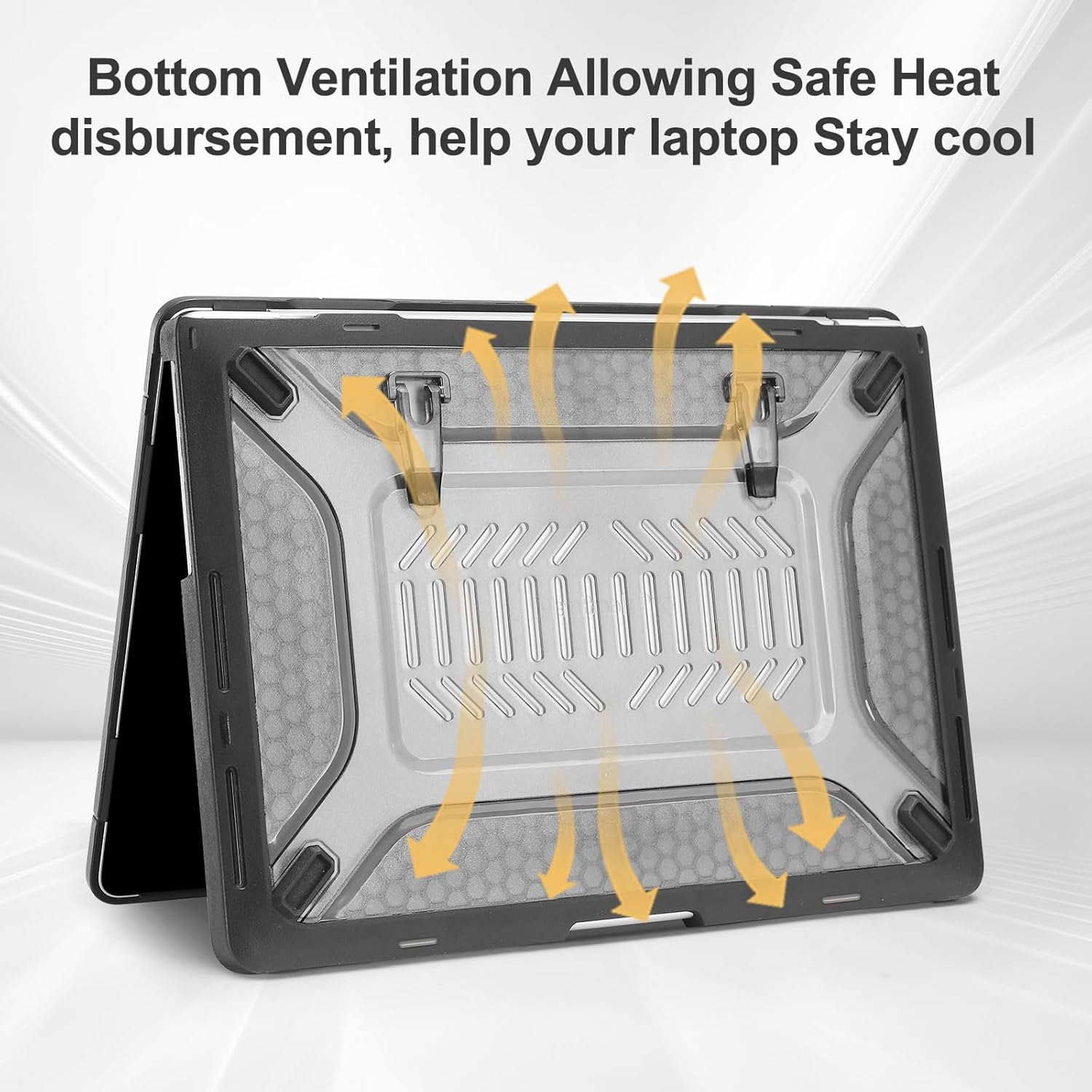 The built-in foldable kickstands provide an appropriate ergonomic viewing & typing angle, give you a better visual experience. Engineered shock-absorbing beveled ridges honeycomb design wraparound TPU bumper heavy duty hard shell, provides ultimate protection for your laptop against scratches, drops, accidental scuffs and other damages.