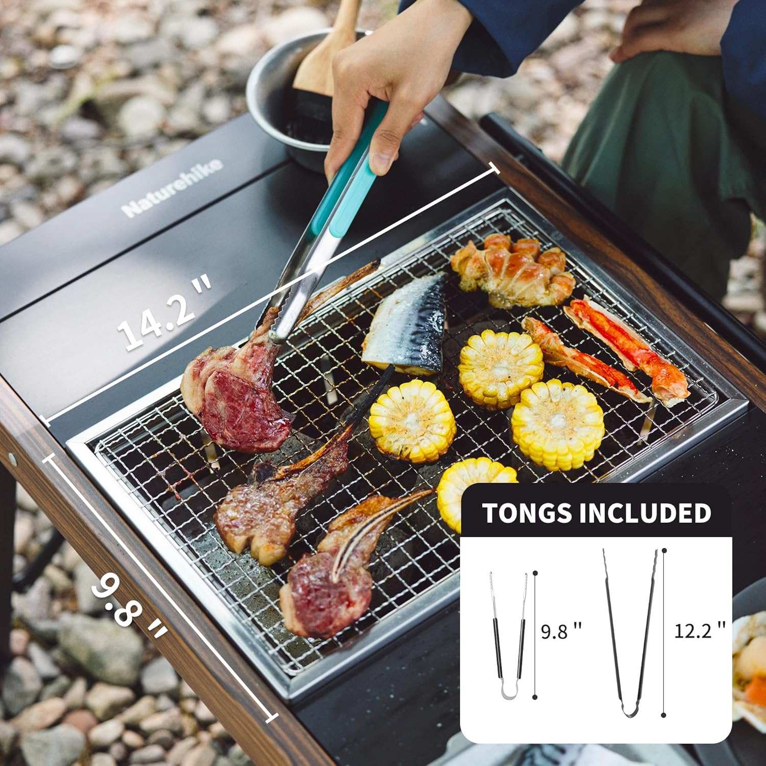[SET UP & FOLD IN SECONDS] Naturehike folding grill requires no assembly, it can be taken out of the carry bag and set up in seconds. 2 BBQ tongs and carry bag included.