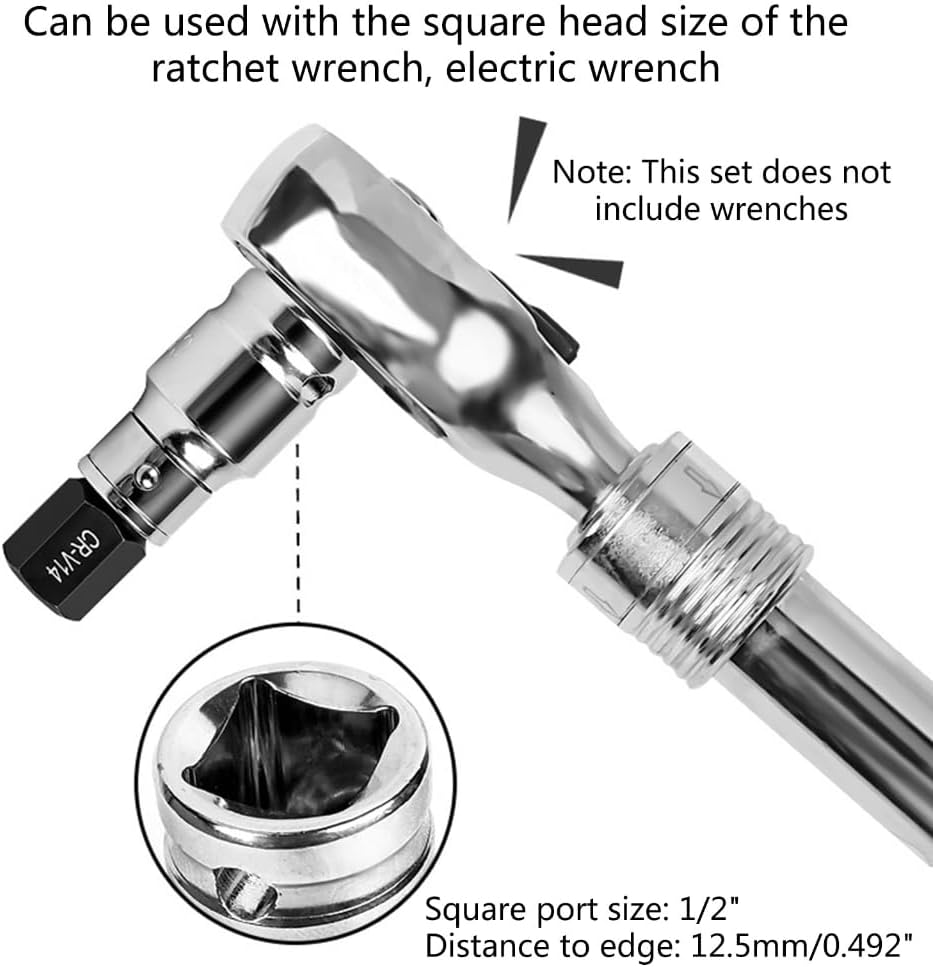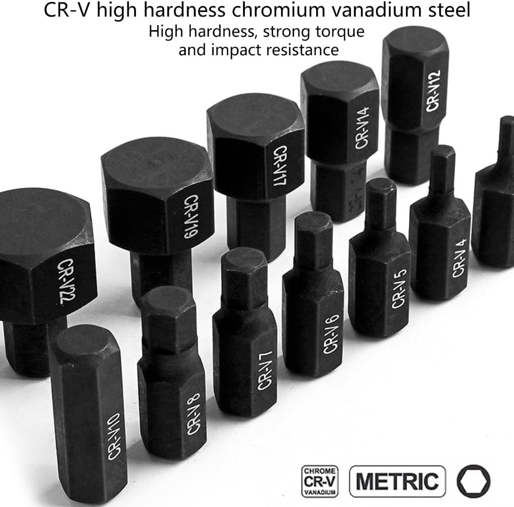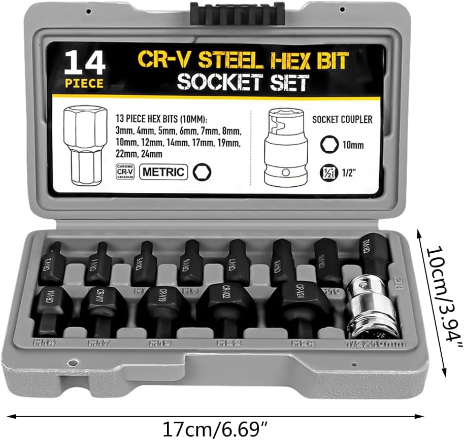 Features:This set includes 14 different sizes of socket wrench head, suitable for various mechanical repairs and assemblies. Crafted from high quality vanadium steel, these sockets are durable and reliable.With precise sizing, these sockets provide a perfect fitting to bolts and nuts. The included plastic case allows for easy transportation and storage, making it convenient for outdoor use.Designed for mechanics, automotive technicians, and DIY enthusiasts, this set is perfect for individuals who need to disassemble and install bolts and nuts.These sockets can be widely used in automotive repairs, home renovations, maintenance tasks, and household appliance repairs, catering to diverse needs in different fields.Upgraded your collection with this versatile set of socket wrench head, providing you with essential tools for any repair or assembly task. Get yours now and enjoy the convenience and reliability they offer!Specifications:Material:Chrome VanadiumBit Length:Approx.30mm/1.18''Socket Length:Approx.38mm/1.49''Bit:H 3 H4 H5 H6 H8 H 10 H12 H14 H17 H19 H22 H24Note:Please allow 1mm errors due to manual measurement. Due to the difference between different monitors, the picture may not reflect the actual color of the item.Package Includes:14Pcs Hexagon Bit Socket