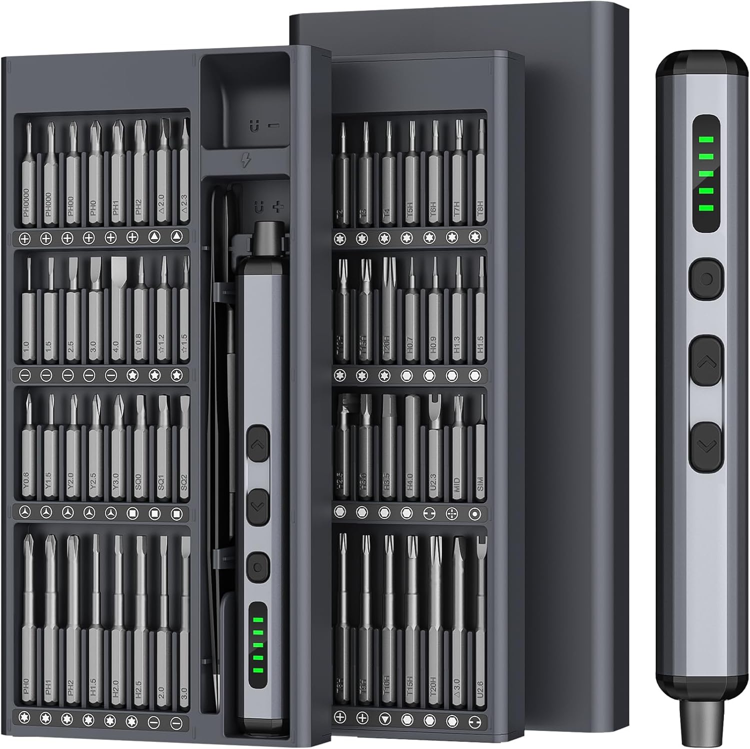 【What's in the box】1 mini electric screwdriver, 1 storage box, 64 precision bits (all bits see picture), 1 tweezers, 1 pry bar, 1 size plate, 1 adsorption plastic, 1 hanging pin, USB Type-C charging cable, 1 user manual
