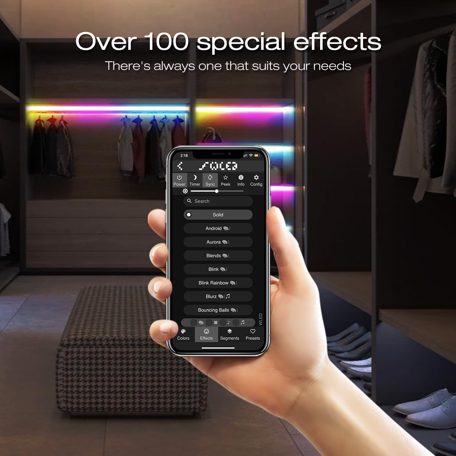 Wireless control via wled app: Users can control the LED strip through the free wled app. This app provides an intuitive user interface, allowing users to adjust color, brightness, dynamic effects, and create custom scenes and scheduled tasks