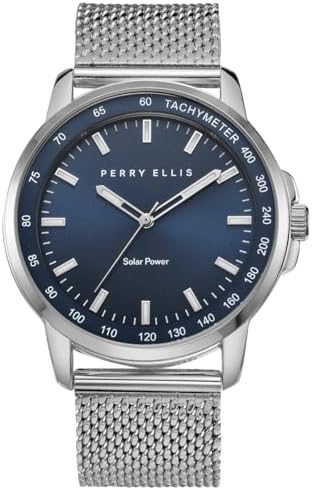 Perry Ellis Solar Powered Mens Watch | Steel Mesh Band | Water-Resistant Analog Wrist Watches for Men | 43mm Case | Aluminum Tachymeter Bezel | Elegant Gift for Man
