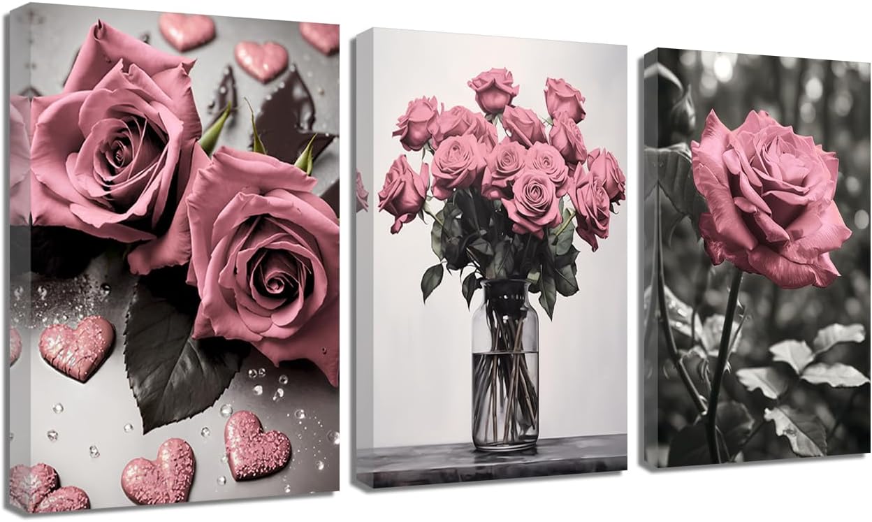 ZQQART Pink Rose Wall Art 3 PCS Bloom Pink Flower Canvas Prints Rustic Black and White Pink Floral Painting for Girls Room Wall Decor (Pink12.00" x 16.00" x 3)