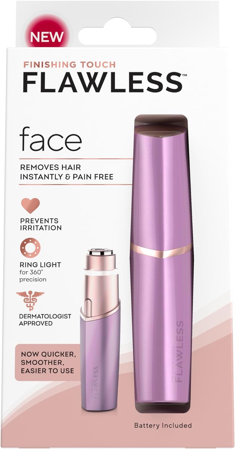 Finishing Touch Flawless Removedor de Pelo Facial para Mujeres es el revolucionario dispositivo de eliminación de vello facial que elimina el vello de manera fácil, efectiva y sin dolor. Disfrute de una piel suave y sin vello sin el enrojecimiento, la irritación o los cortes, protuberancias o rasguños que vienen con el afeitado. Con un diseño fácil de sostener, esta afeitadora eléctrica para mujeres es ideal para eliminar el vello fino, cejas centrales, mejillas, barbilla y labio superior, o se puede usar como recortador de cejas. El recortador de vello Flawless es recomendado por dermatólogos, hipoalergénico y ayuda a que el maquillaje se aplique más suavemente y los productos de cuidado de la piel se absorban más rápido. Para usar, inserte la pila AA incluida, retire la tapa y active el interruptor de la afeitadora facial eléctrica. Presione suavemente el dispositivo de eliminación de vello plano contra la piel y haga pequeños movimientos circulares. La revolucionaria Tecnología Mariposa con más del 60% de cuchillas que las versiones anteriores del Removedor de Pelo Facial Finishing Touch Flawless elimina el vello no deseado bajo una cabeza chapada en oro de 18 quilates, sin tocar la delicada piel facial. Este removedor de vello facial está diseñado para verse como un tubo de barra de labios y está equipado con una luz LED, para que pueda llevarlo a cualquier lugar que vaya para una depilación discreta y precisa en cualquier momento. Siempre sea Flawless.