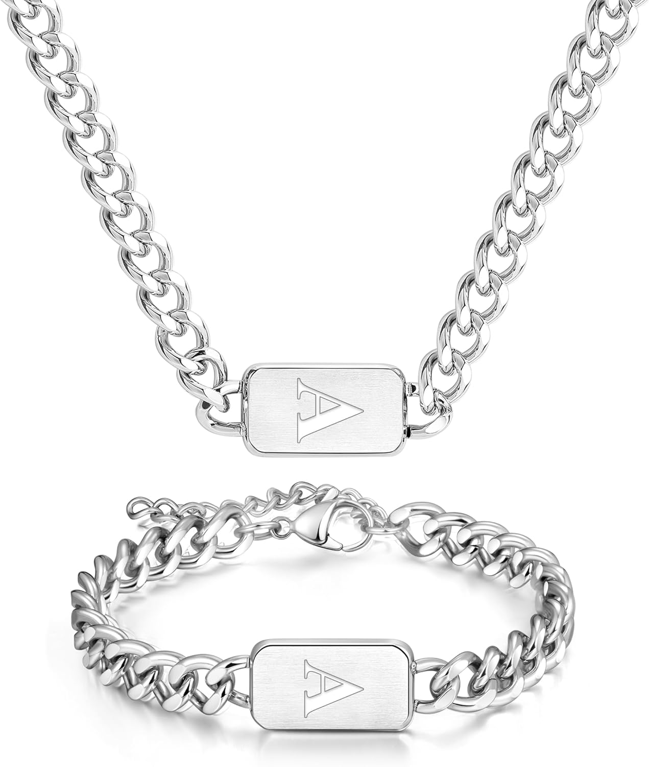 men's silver initial necklace bracelet Jewelery set for boy 2pcs Cuban chain Personalized name letters A-Z adjustable stainless steel link for men gift for him/her gift for boyfriend boys son