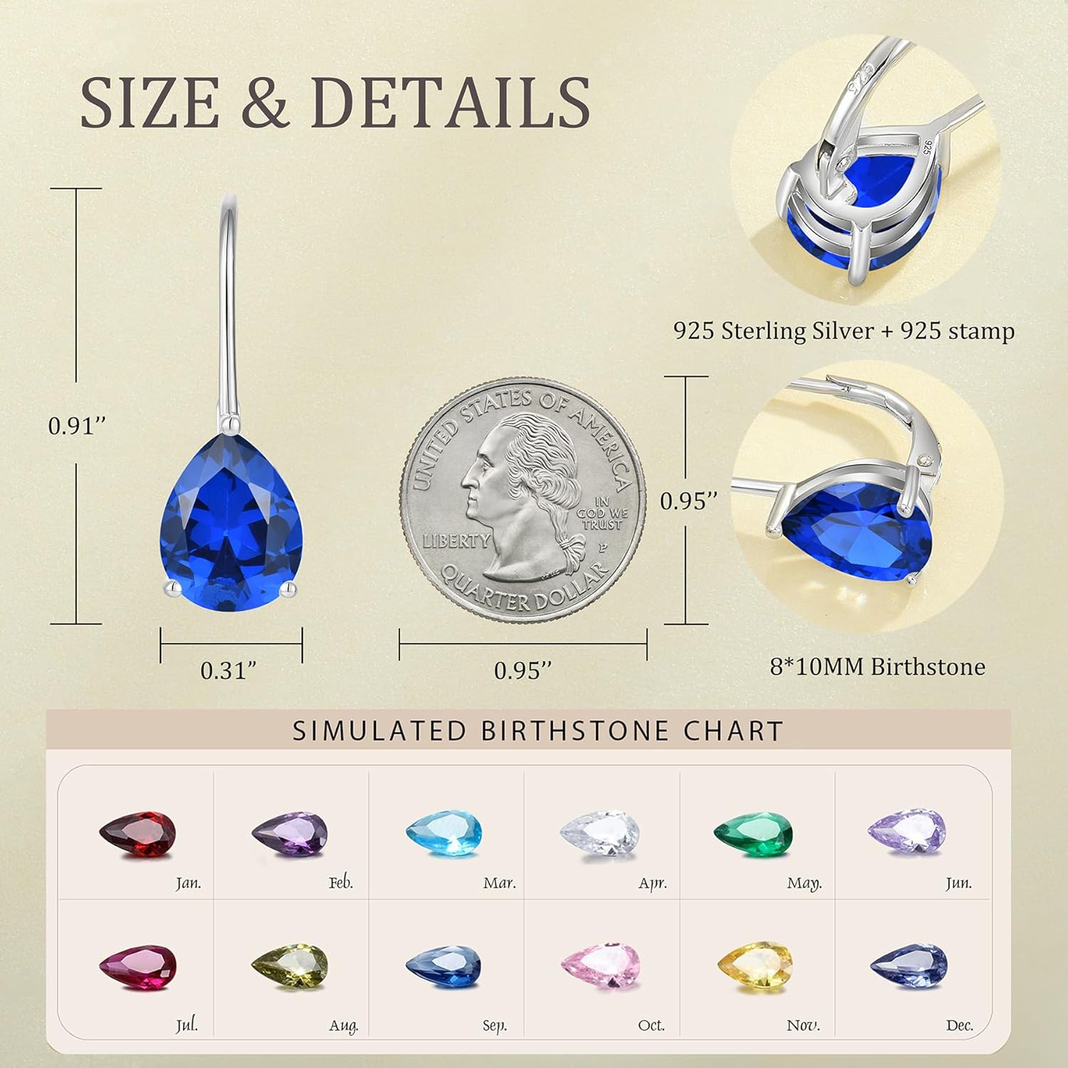JO WISDOM Women Earrings 925 Sterling Silver 8 * 10mm Pear Cut Cubic Zirconia Leverback Dangle Earrings Birthstone Earrings for Women Hypoallergenic Jewelry