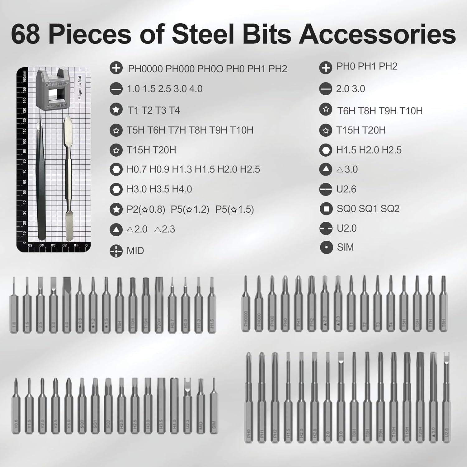 【72-IN-1 Precise Screwdriver】MQFORU precise electric screwdriver kit is equipped with 64 different types of S2 steel bits, precision screwdriver storage box x1, electric screwdriver x1, magnetizer/demagnetizer x1, magnetic pad x1, metal spudger x1, tweezers x1, triangular opening pick x3, type-C cable x1, instruction manual x1, which can assemble and disassemble most electronics products, meet your work daily needs.