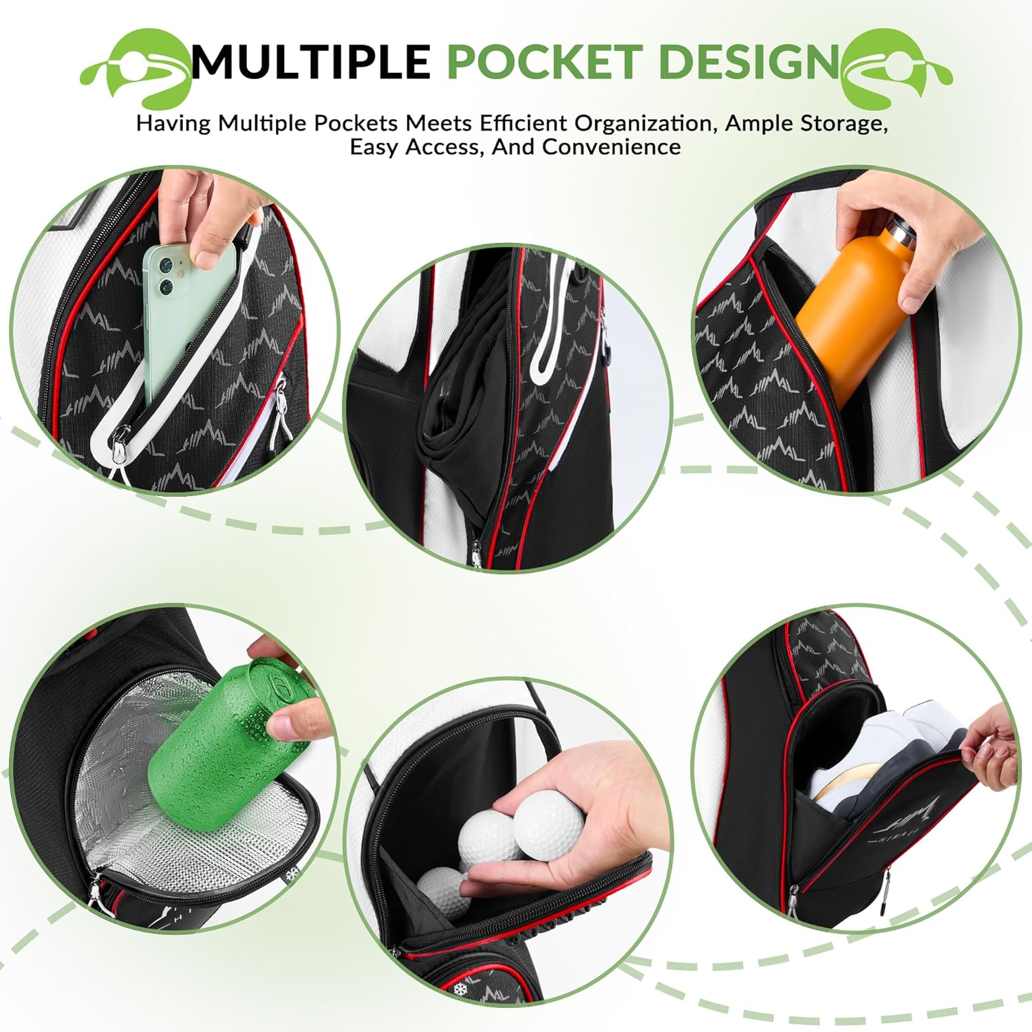Convenient Features:Includes adjustable drawstring to securely hold an umbrella and hooks for gloves and towels, adding to the bag's overall functionality. This makes it an excellent choice among golf cart bags for men who need convenience and organization on the course.