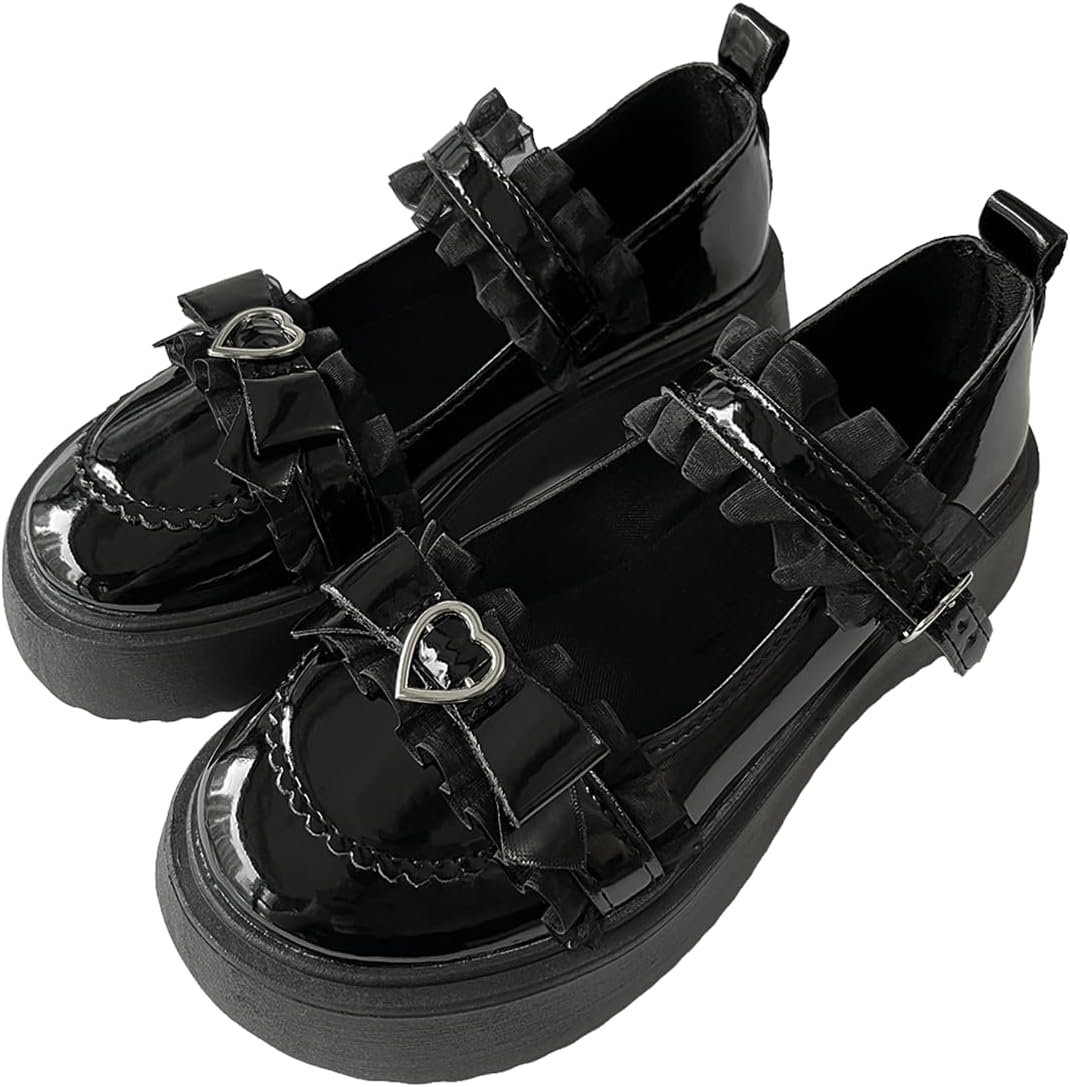 Y2K Goth Kawaii Harajuku Lolita Round Toe Chunky Heels Heart Buckle Black Lace Trim Mary Jane Platform Shoes