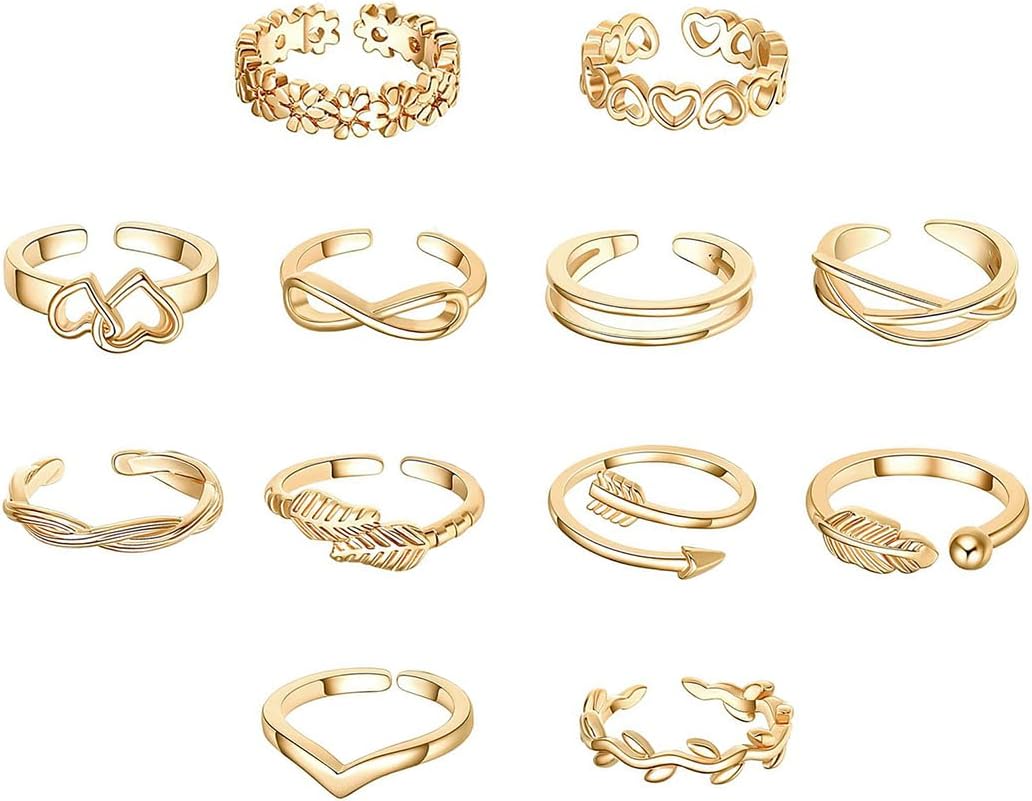 12PCS Toe Rings for Women 14K Gold/Silver Plated Adjustable Toe Ring Set Open Heart Arrow Infinity Rings Beach Foot Jewelry for Summer