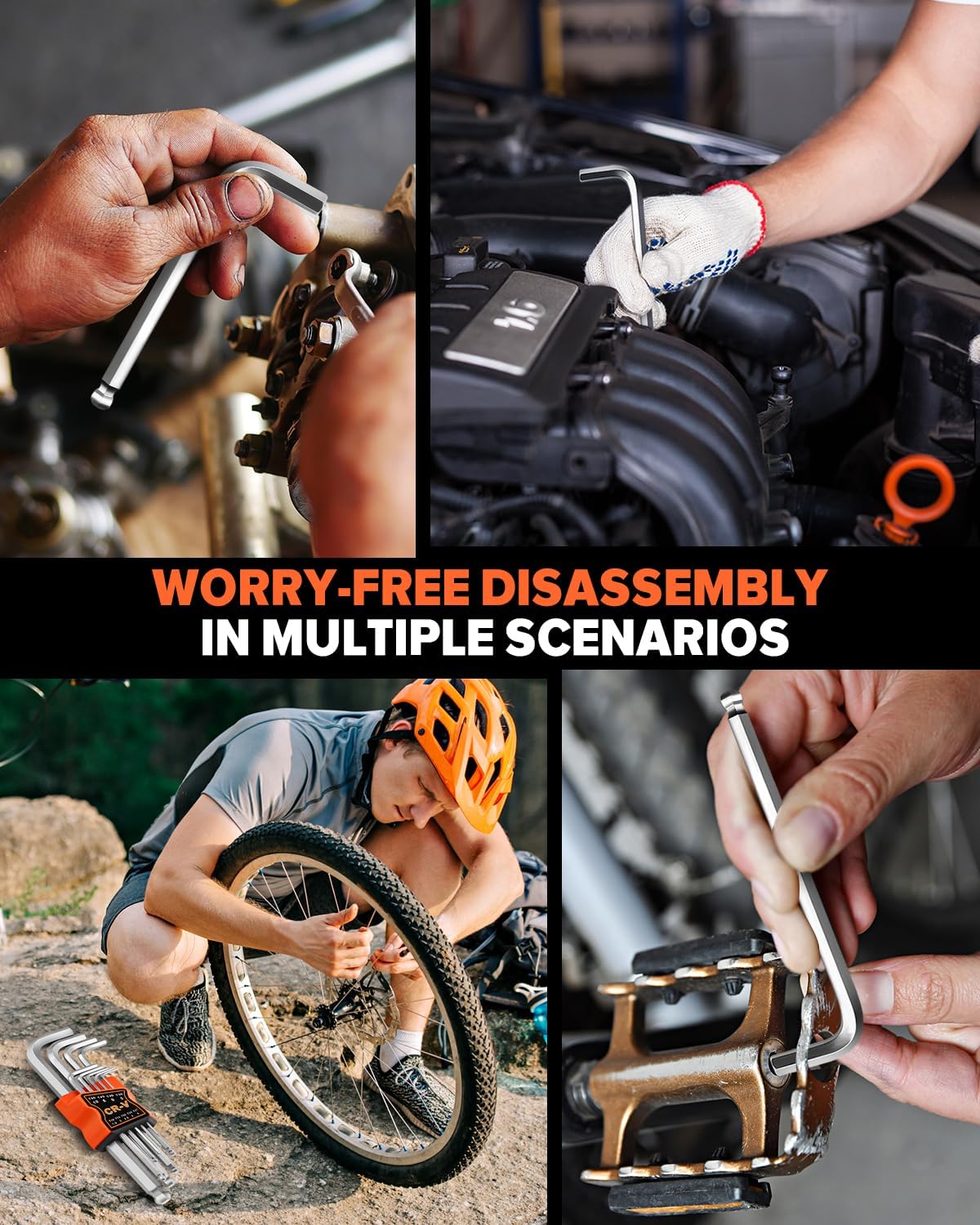 Easy identification and grip: Each allen key is color-coded and features a heat-treated and chrome-plated finish, ensuring easy identification and a slip-resistant grip, even with oily or dirty hands