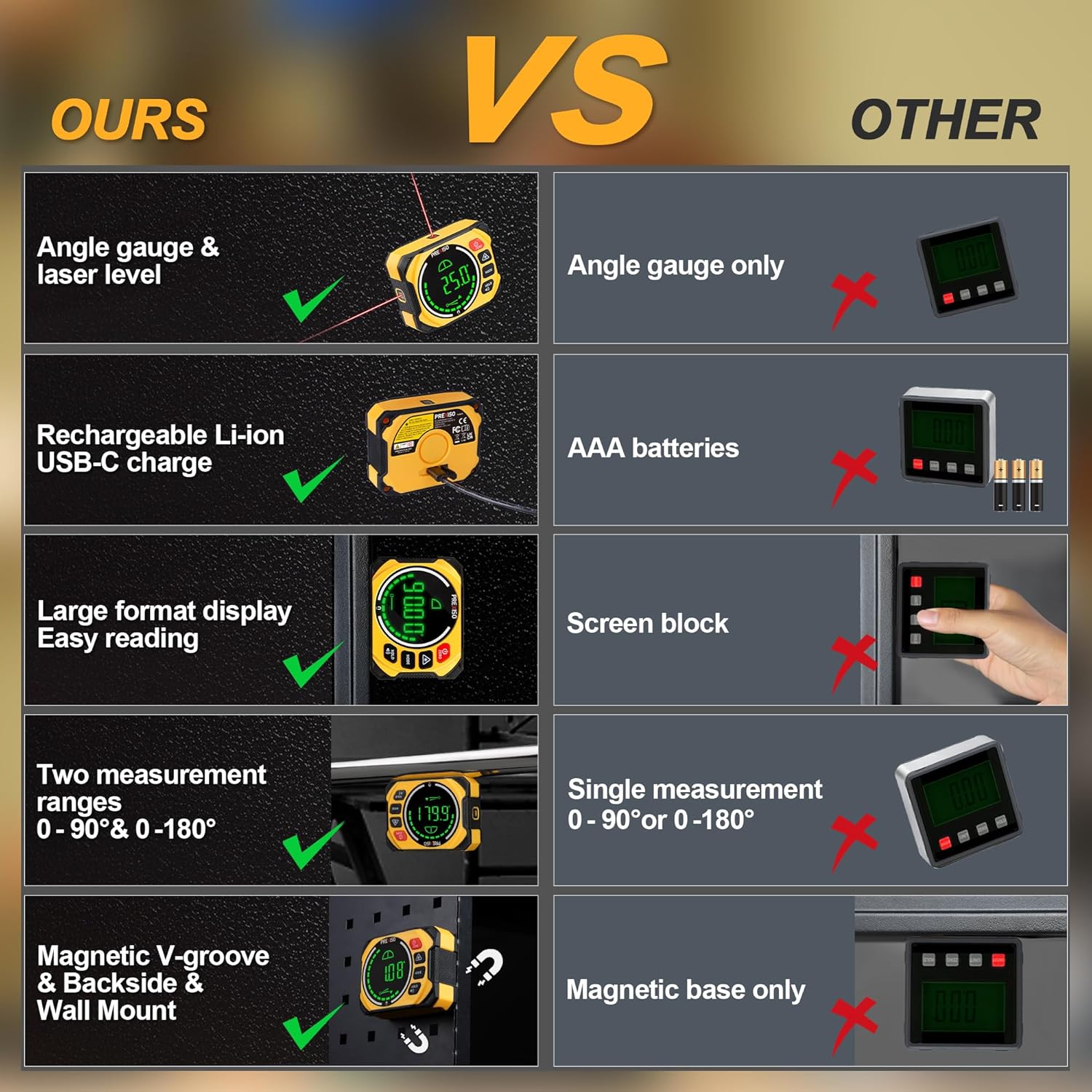 PREXISO 3-in-1 Multi Surface Laser Level with Digital Angle Gauge Magnetic, Rechargeable Digital Level with Wall Mount Base, 0-90° & 0-180°, Angle Finder Cross Line for Woodwork, Saw, Hanging Frames