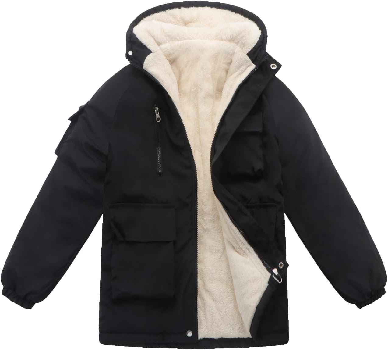 Winter Kids Boys Snow Coats Black Puffer Jacket Hooded Clothes Fleece-Lined Wear