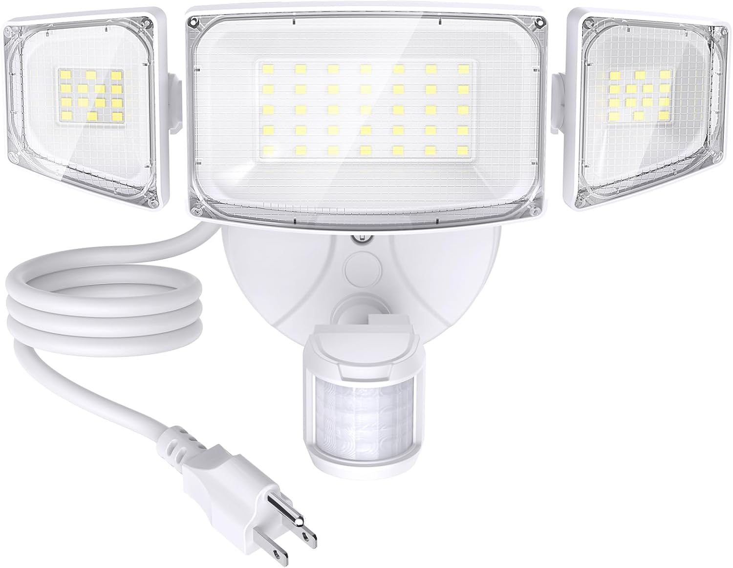 Olafus 42W Motion Sensor Outdoor Light Plug in, Motion Flood Light Dusk to Dawn, 5000LM LED Security Light IP65 Waterproof, Motion Activated 6500K PIR Sensor Lighting for Garage Yard Patio Eave, White