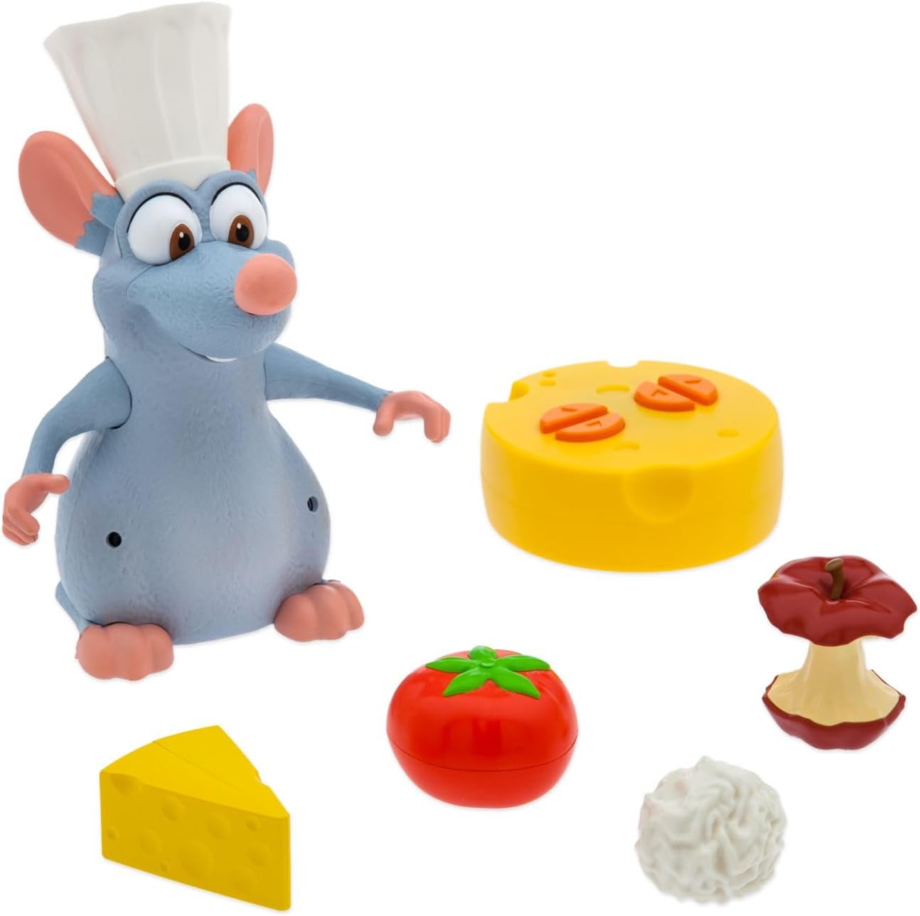 Featuring Remy, remote control cheese wheel and toy tomato, apple core, cheese wedge and white ball