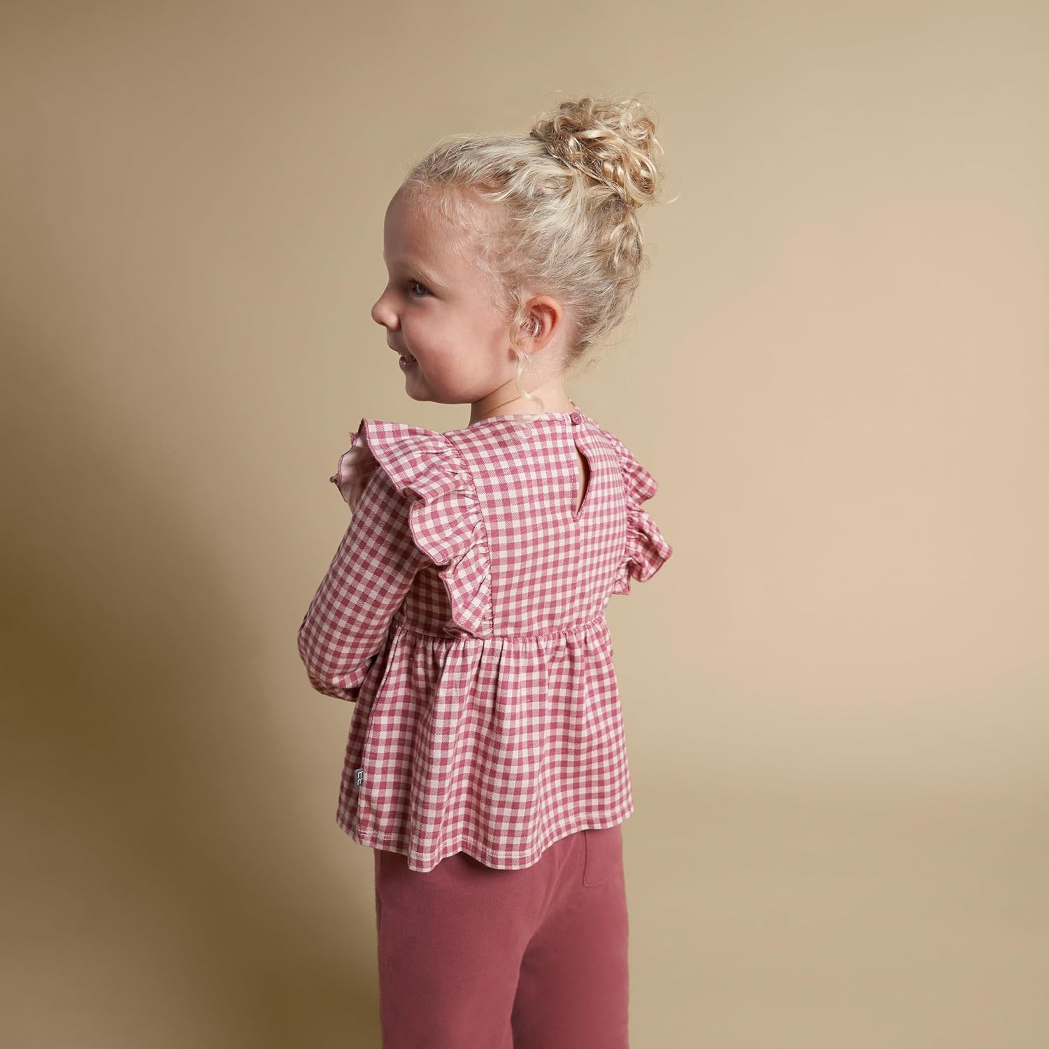Elevate your little one's style with our adorable baby or toddler top and pants set, made from 100% cotton for a gentle feel on sensitive skin! Perfect for cooler weather, this set features long sleeves and pants to keep your child warm and cozy. Elastic at the sleeve cuffs and pants' waistband provides a comfortable fit that moves with your little one as they play or go about the day. And with faux wood buttons on the back of the shirt to secure the top and stylish shoulder ruffles adding a touch of charm, this set is sure to become a wardrobe favorite.
