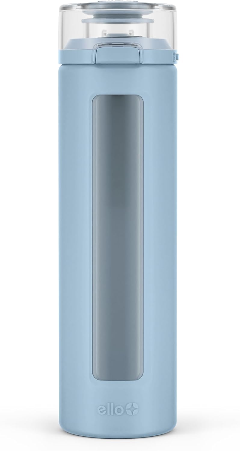 Ello Syndicate 20oz Reusable Glass Water Bottle with One-Touch Leak Proof Flip Lid, Protective Non-Slip Silicone Sleeve, Carry Loop for Coffee, Tea and Water, BPA-free, Dishwasher Safe, Tech Blue