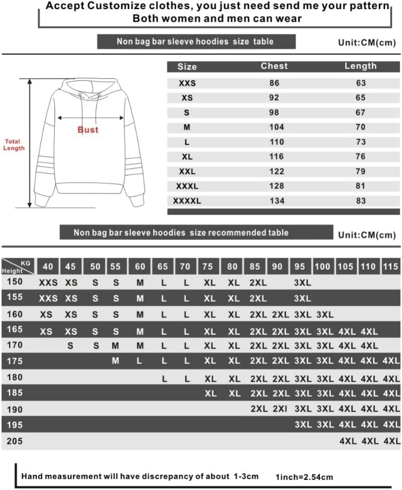 Purchase sizes chart Size:XXS,Bust:86cm,Length:63cm,Shoulder:39cm,Sleeve:58cm Size:XS,Bust:92cm,Length:65cm,Shoulder:41cm,Sleeve:60cm Size:S,Bust:98cm,Length:67cm,Shoulder:43cm,Sleeve:62cm Size:M,Bust:104cm,Length:70cm,Shoulder:45cm,Sleeve:64cm Size:L,Bust:110cm,Length:73cm,Shoulder:47cm,Sleeve:66cm Size:XL,Bust:116cm,Length:76cm,Shoulder:49cm,Sleeve:68cm Size:XXL,Bust:122cm,Length:79cm,Shoulder:51cm,Sleeve:70cm Size:XXXL,Bust:128cm,Length:81cm,Shoulder:53cm,Sleeve:72cm Size:4XL,Bust:134cm,Length:83cm,Shoulder:55cm,Sleeve:74cm Size:it is smaller than US size,please choose 1-2 size up You can also choose the right size according to your height (cm) and weight (kg) according to our size chart