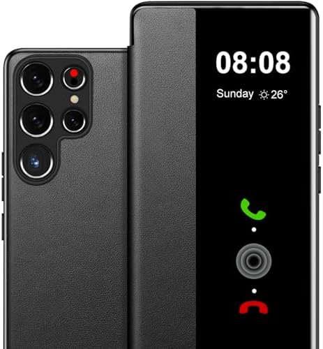 Funda de cuero con solapa para Samsung Galaxy S24 Ultra, hecha de cuero PU de alta calidad y carcasa de PC, combinando artesanía tradicional y diseño moderno. Ofrece una protección duradera y cómoda para su teléfono. La ventana transparente S-View le permite ver la fecha, hora y otras informaciones sin abrir la funda. Cuenta con recortes precisos para todos los botones y puertos, asegurando una funcionalidad completa y una experiencia de uso fluida. Ideal para proteger su dispositivo de arañazos, golpes y daños diarios, esta funda es el regalo perfecto para Navidad, cumpleaños y otras ocasiones especiales. Ofrece una defensa de 360 grados para una protección completa y duradera.