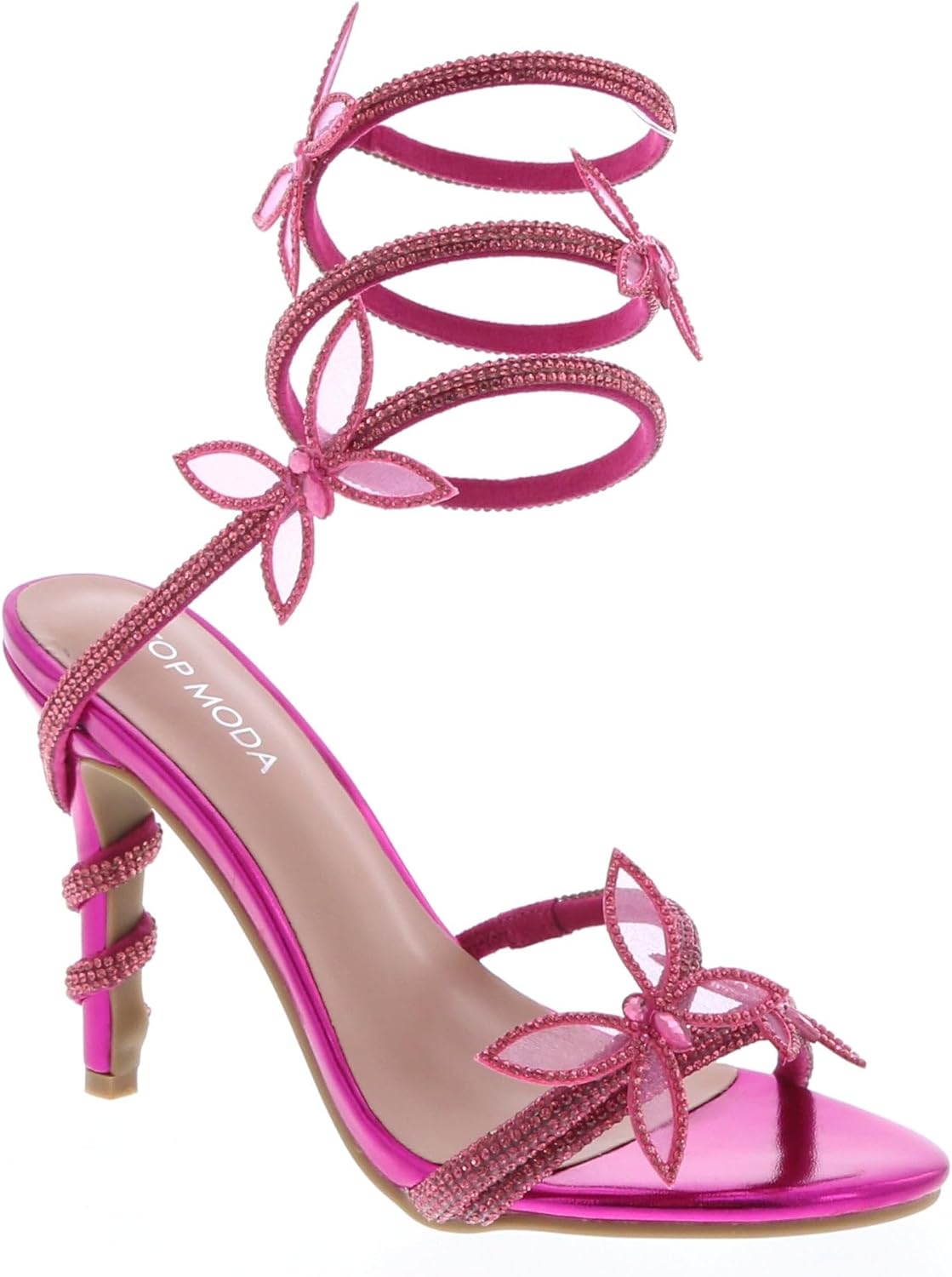 TOP MODA Women's Open Toe Formal Rhinestone Butterfly Spiral Wrap Around Stiletto Heel Sandals, Fuchsia Metallic