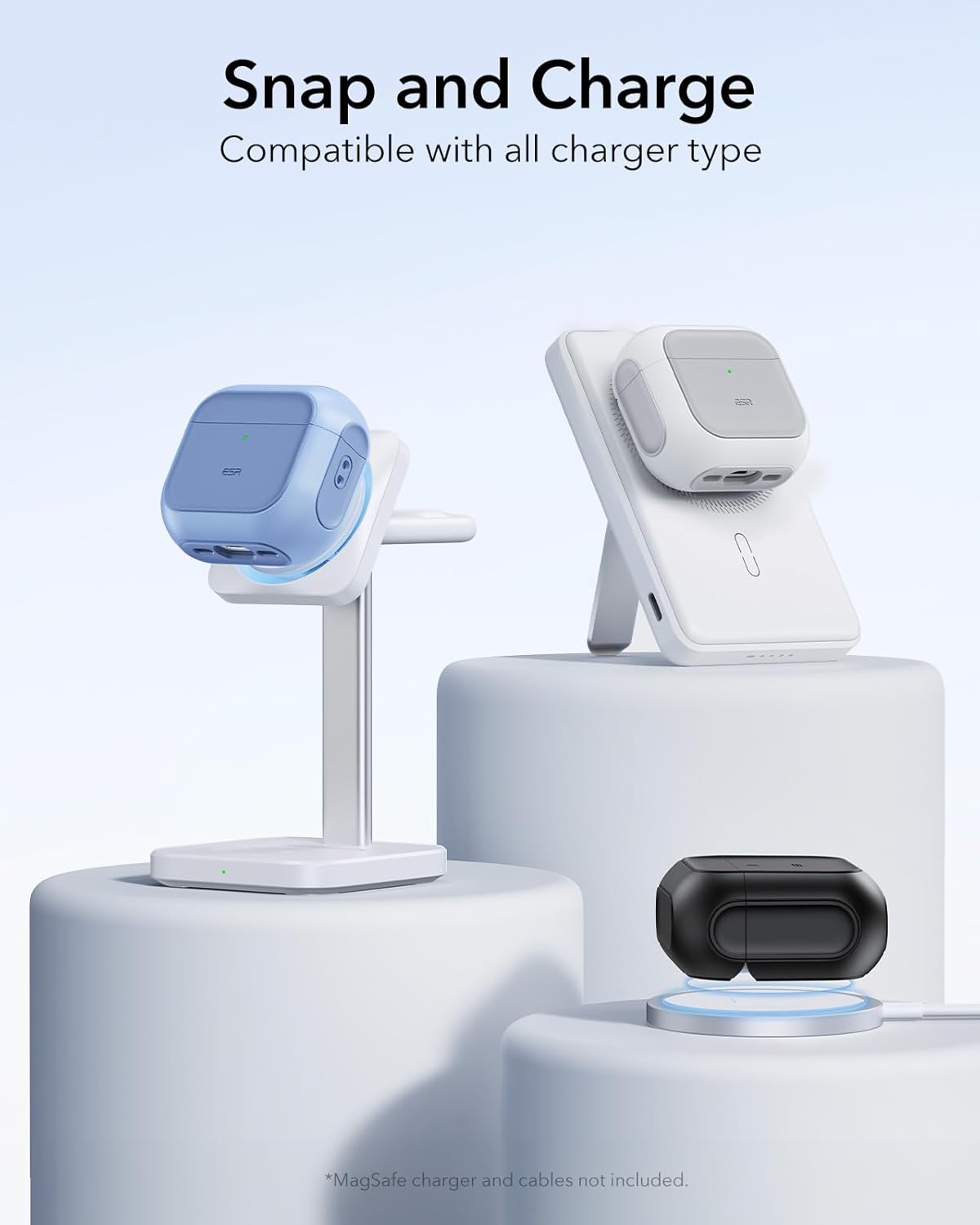 Listo para MagSafe: los fuertes imanes en la parte trasera del estuche aseguran un bloqueo seguro en los cargadores MagSafe, permitiéndote disfrutar del cargamento inalámbrico tap-and-go para tus auriculares; la carga inalámbrica es solo para AirPods 4 con cancelación activa de ruido