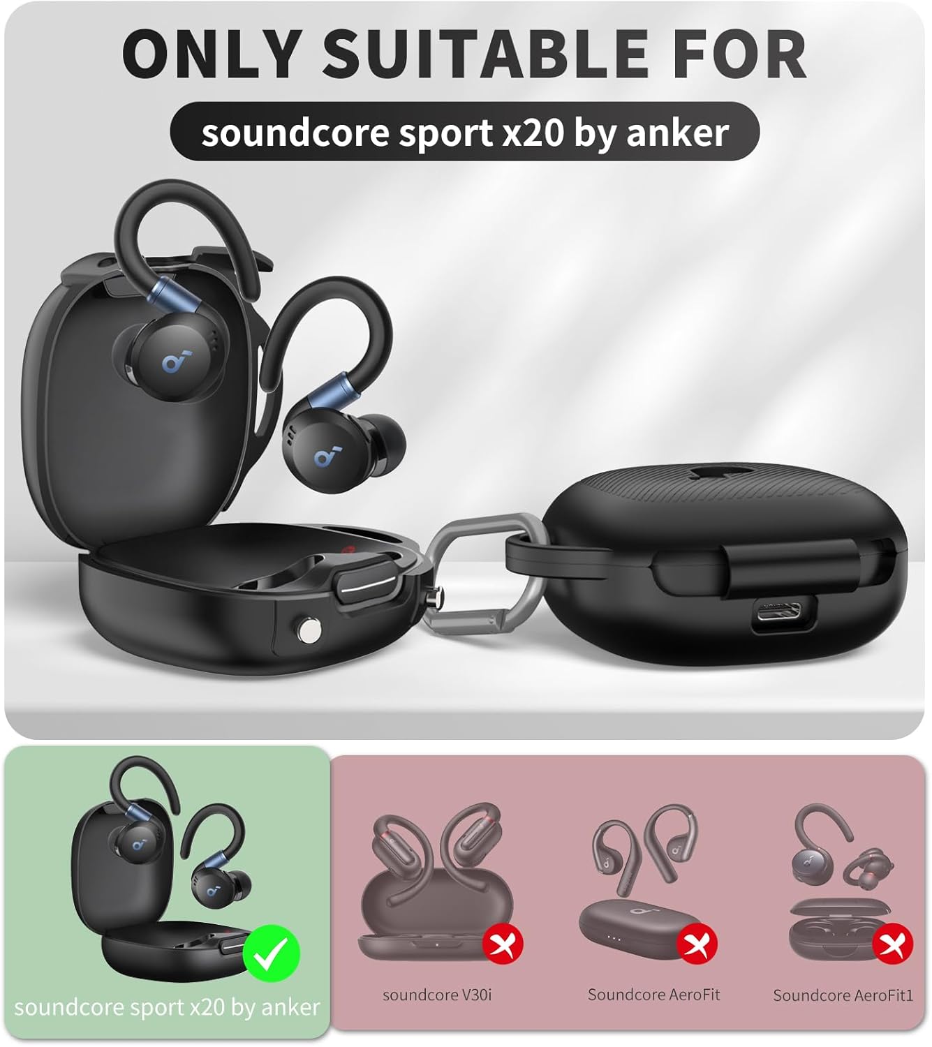 WADVCU upgrades silicone case cover for Anker Soundcore Sport X20. Make you can't have to worry about your Anker Soundcore Sport X20 earbuds getting scratched, bumped, dropped, or lost again. Features: Logo hollow design, make your earphone different. Secure lock design, can firmly fix the upper and lower cover of the shell. You don't have to worry about dropping your headphones and losing them and having to pay for new ones. Ultra lightweight and thin can keep your Anker Soundcore Sport X20 handiness. The form of the silicone case fits snugly over the charging case, you will no longer have to worry about dropping or scratching your Anker Soundcore Sport X20 anymore. Grooving design gives you easy access to the lightning port, charge your Anker Soundcore Sport X20 without removing the case. Anti-Static Hydrophobic, micro-matte technology, Resist gentle water spray & splash, not easy to dust, convenient washing. Comes with a carabiner , you can hang it everywhere you want. Material: Premium Silicone--Made of premium silicone material, environmental protection, you can rest assured to use. Compatible Devices: Package include: 1 x Silicone Case 1 x Detachable & Durable Carabiner NOTICE: Anker Soundcore Sport X20 earbuds and Soundcore AeroFit charging case are not included.