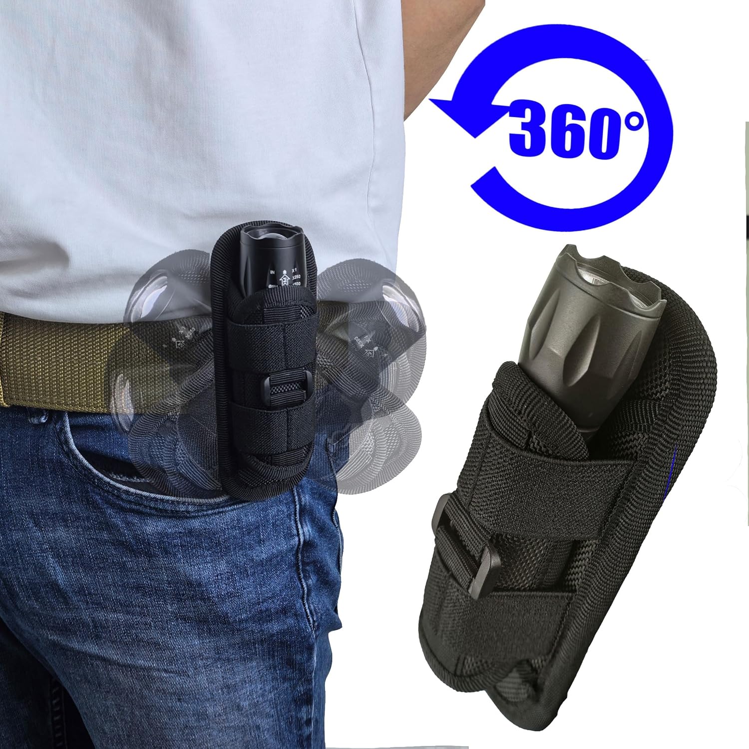 Thoughtful Design: Open design, easy to open/close the flashlight tail cap switch. Adjustable tactical flashlight holster with 360 degree swivel clip for duty belt. Note: Flashlight not included.