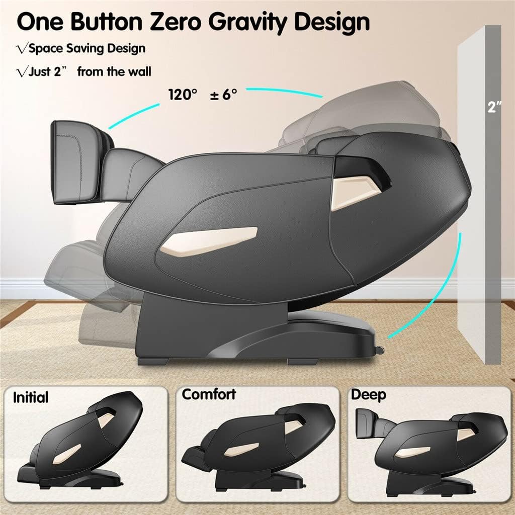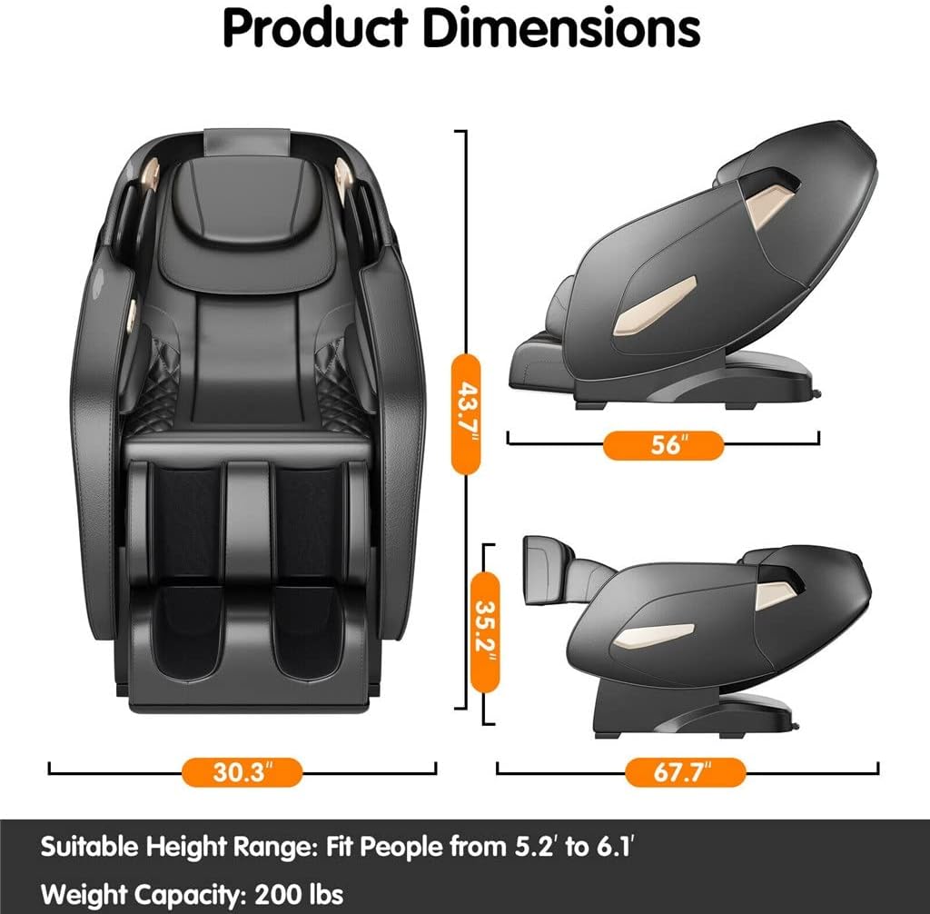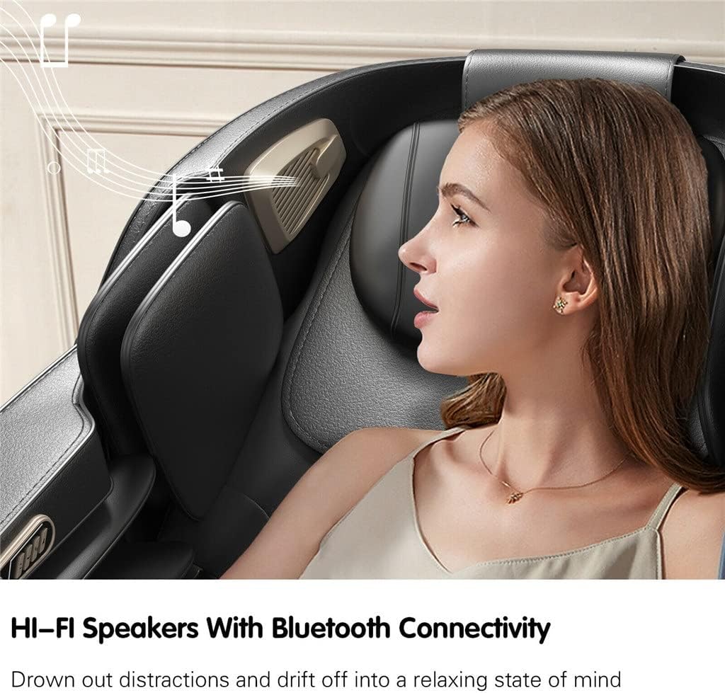 Description:A dream massage chair for anyone who is looking for a significant raise in their daily comfort and satisfaction.This massage chair has the latest zero system, which has 3 levels angles for weightlessness position to relieve the spine pressure. A built-in audio speaker connects your phone through and brings music to the massage. And it also has a SL track to perfectly fit your body curve. The upgraded electric linear actuators can realize independent leg and back position adjustment. A sophisticated auto body scanner is equipped to build the massage chair into your body shape and height. And to show its functional diversity, the massage sofa has 12 automatic massage programs, 6 massage techniques, 32 airbags, back heater and foot rollers. There are 4 massage areas, 6 adjustable speeds, 3 adjustable widths and 3 air pressure intensities to choose from. And yoga stretching function can relax the muscles of the whole body.Features:button zero and space-saving design is only 2” from the wall135 cm long SL track can trace neck down to thighs to provide a larger rangeAuto body scanner can reshape the massage chair according to your height,weight and spine6.5” retractable calf frame to adapt to of different heights32 airbags cover the shoulders, arms, waist, calves and feet to relieve muscle fatigueBack heater of 131°F is good for blood circulation and keeps you warmThe foot part has 3 speeds for roller massageYou can set a timer of 10, 20, 30 minutesTFT screen remote control and armrest shortcut keys are easy to operate, especially for the elderlyRemovable PU leather headrest for cushioning massage strengthA charging port to charge mobile phone or other electronic productsBuilt-in wheels for easy movementEasy to assemble according to detailed and clear instructionsSpecifications:Color: BlackMaterial: PP, ABS, Steel, PU Leather, SpongeProduct Dimension o
