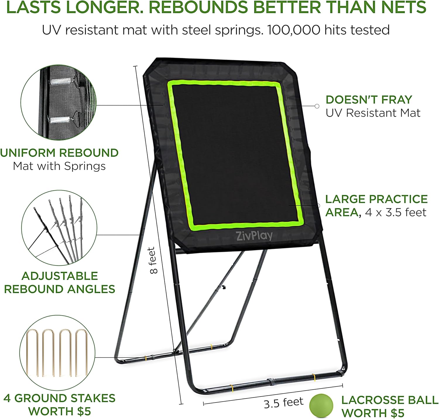 MAT WITH SPRINGS - REBOUND BETTER THAN NETS, shock absorbing surface connected through 34 steel springs. Maintains rebound elasticity even after 100,000 hits! UV RESISTANT REBOUND MAT, designed for long lasting outdoor use without deterioration from sun exposure. Perfect lax rebounder for lacrosse outdoor practice.