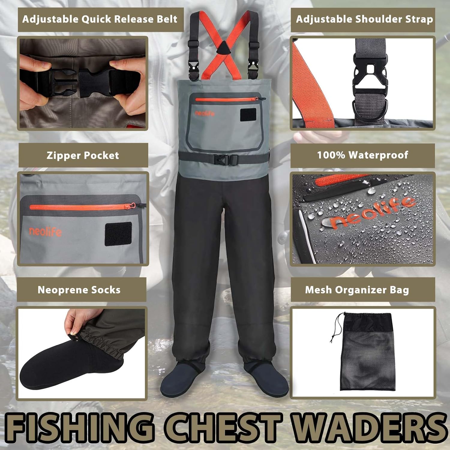 DUTILITY & DURABLE --- Fishing waders for men are equipped with a large chest storage pocket that features a waterproof zipper closure allow you to store smartphones, keys, or essentials. High-Quality Adjustable H-back, durable quick release buckles and wading belt design are all convenient for Fishing. The product included a mesh organizer bag for storage of your chest waders