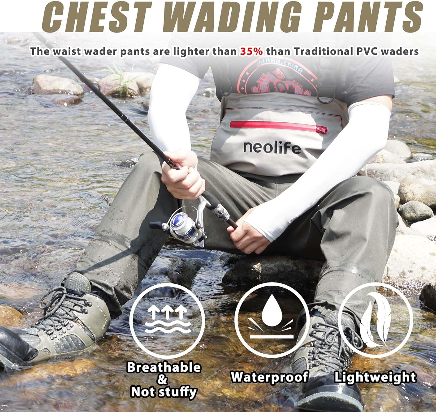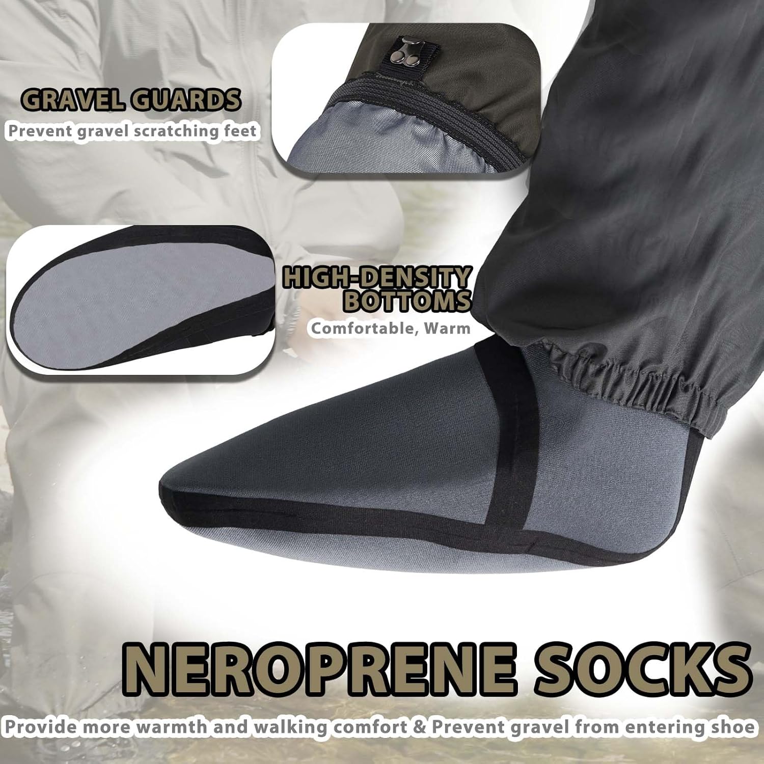 NEOPRENE BOOTIES AND GRAVEL GUARDS --- The chest waders 4mm neoprene socks with high-density bottoms provide more warmth and walking comfort. Gravel guards with boot lace hooks can be used with fishing shoes to prevent gravel from entering the shoe and scratching the feet