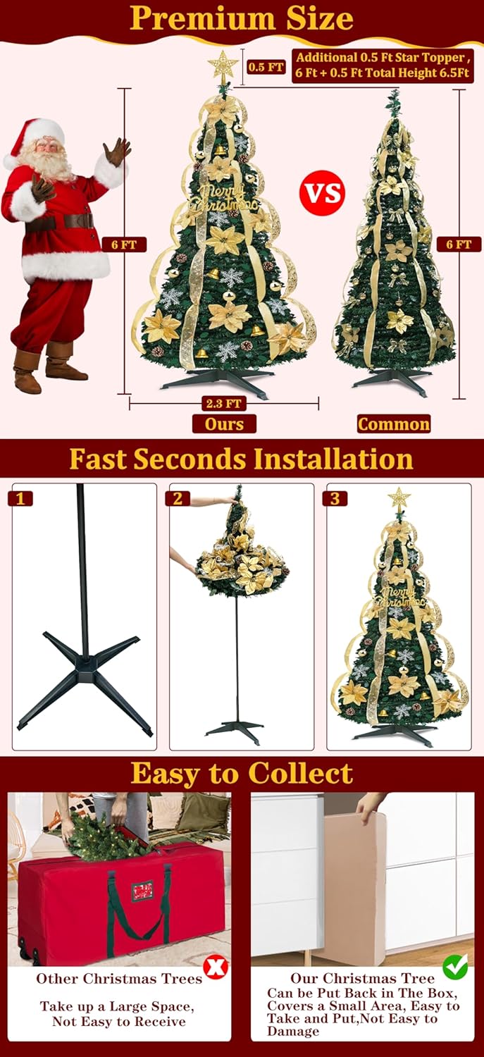 Pop up Christmas tree: 6 Ft Christmas tree features an innovative pop-up design,There's no need for a complicated installation process, and no worries about storage spaces. When the Christmas is over, simply fold it up for storage to save you spaces