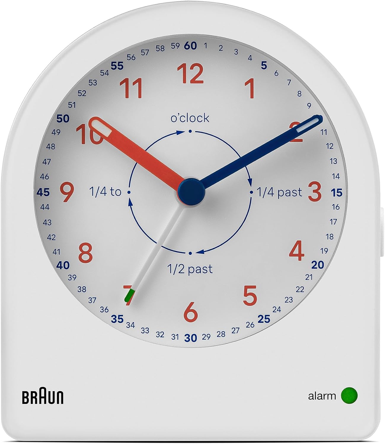 Braun Analogue Time Teacher Alarm Clock with Snooze and Continuous Backlight, Quiet Quartz Movement, Easy to Read Dial, Crescendo Beep Alarm in White, Model BC22TW.